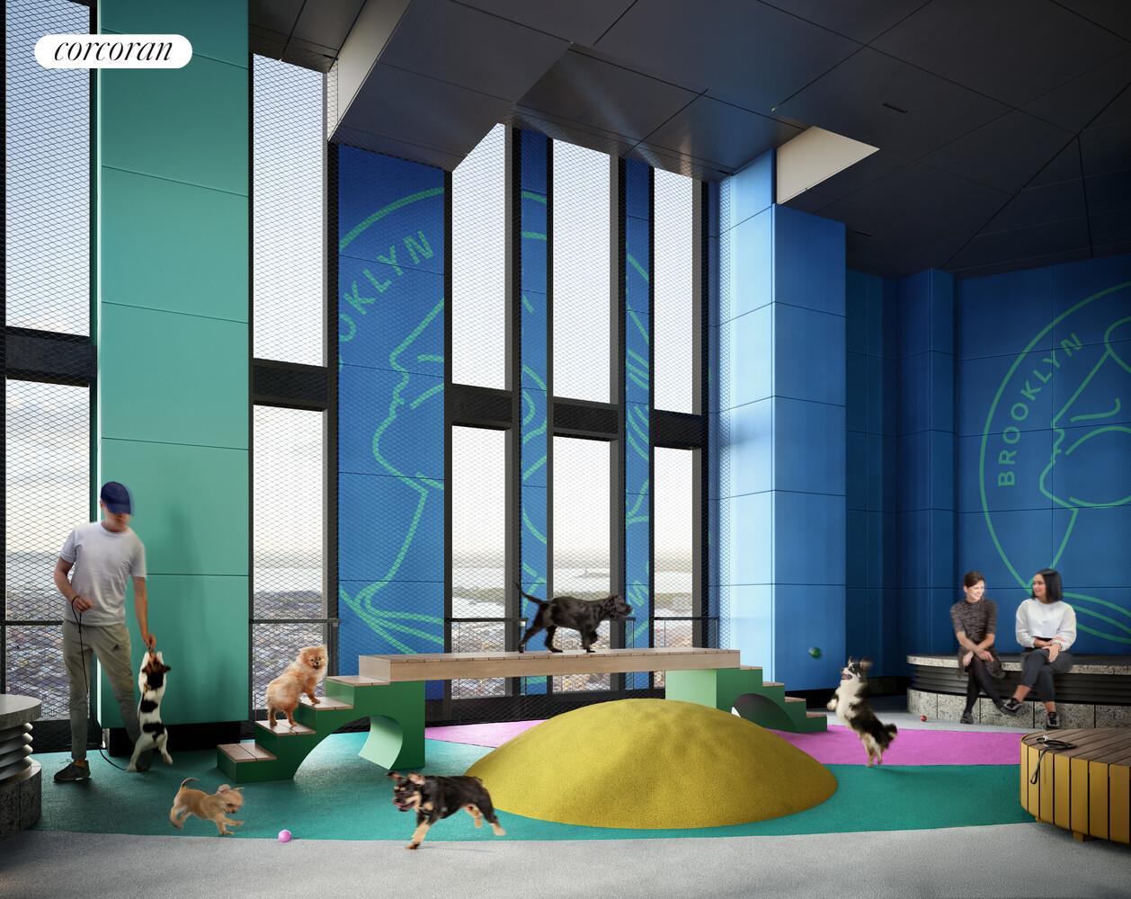 Residents at Brooklyn Tower have access to one of the largest residential amenity offerings in New York. A world-class performance-infused lifestyle, secured with over 100,000 square feet of exclusive indoor and outdoor leisure spaces. Life Time Athletic Club will manage an impressive array of amenities including a 75" outdoor lap pool and whirlpool, fully-serviced poolside lounge and atrium, billiards room, library lounge, conference room, theater with wet bar, and co-working lounge. Dedicated private resident amenities include a children's playroom, limited off-site parking, and the coveted Sky Park, boasting an open-air loggia featuring a basketball court, foosball, playground, and dog run.