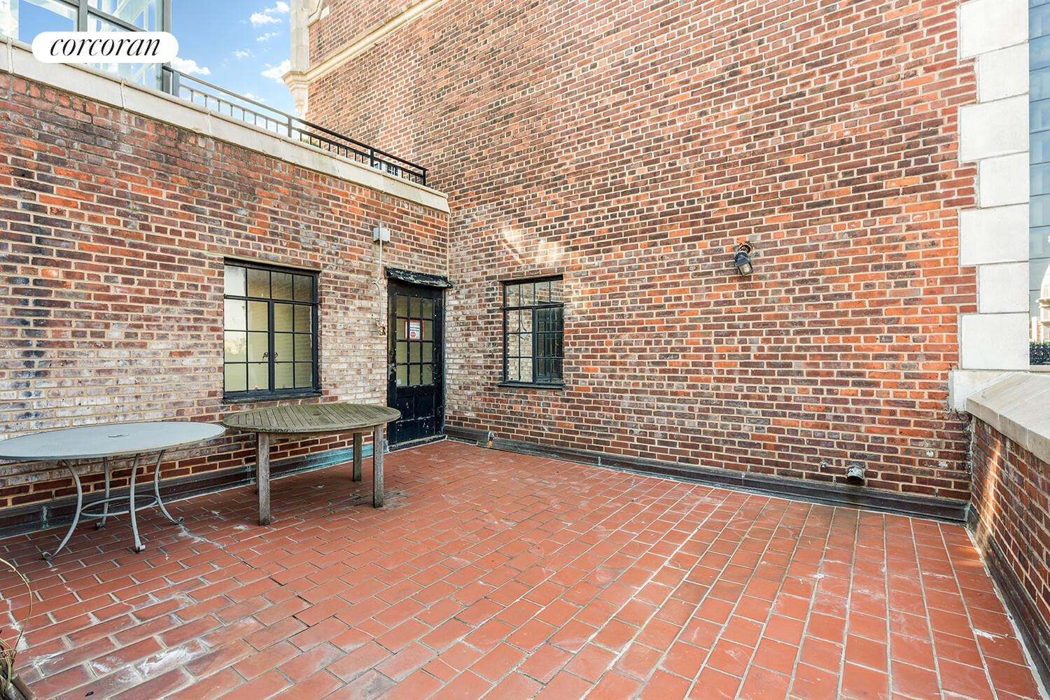 Just beyond, a spectacular private rooftop terrace unfolds as an architectural showpiece in its own right. Measuring approximately 1,802 square feet, (measuring all outdoor space) this sprawling oasis is framed by griffins, gargoyles, and terra cotta pillars that have graced New York's skyline for nearly a century. A convenient kitchenette area serves the terrace level, creating the perfect setting for effortless entertaining. Multiple seating and garden areas capture panoramic views that stretch from the Chrysler Building to the Empire State and the East River beyond. Featured in Bullets Over Broadway and The Godfather Part III, this storied terrace offers a cinematic backdrop unlike anything else in the city.