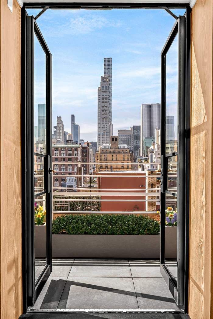 Upon entering the bright living room with west and south exposures, framed by custom built-in bookshelves and ceruse oak paneling that opens directly onto a private 160 sf balcony with iconic views of the midtown Manhattan skyline (pictures to follow).