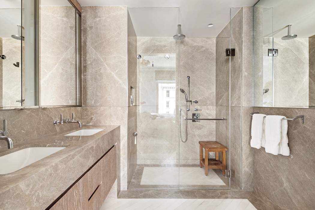 The guest bathroom has been upgraded with a glass enclosed shower, refined stone finishes, and heated floors.