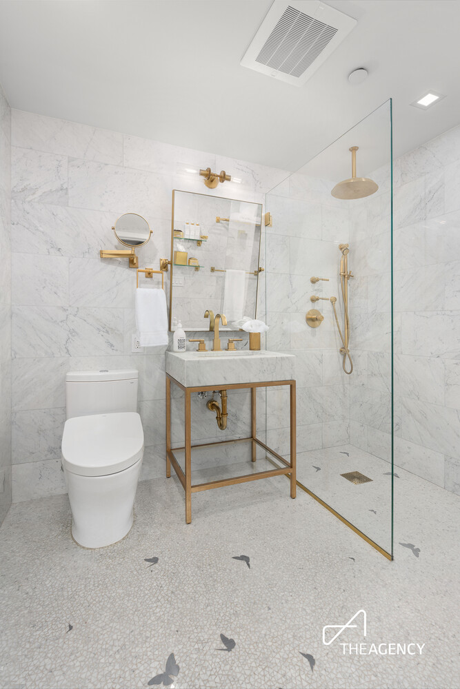 Elevated far beyond sponsor finishes with designer touches throughout, the open kitchen is truly bespoke and serves as the launching point for starting each day anew. Anchored by a five burner Wolf Range and Hood, clad in quartz it awaits your daily indulgences (in moderation of course). The attached walk-in pantry allows for the efficiency of ordering and storage in bulk; a true NY luxury.