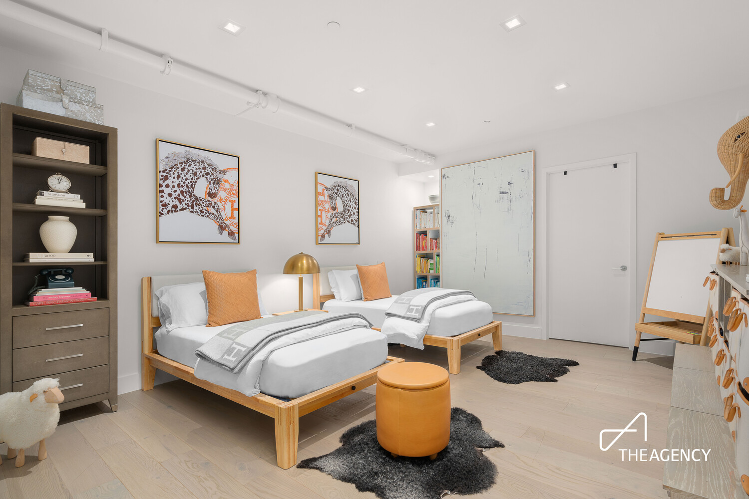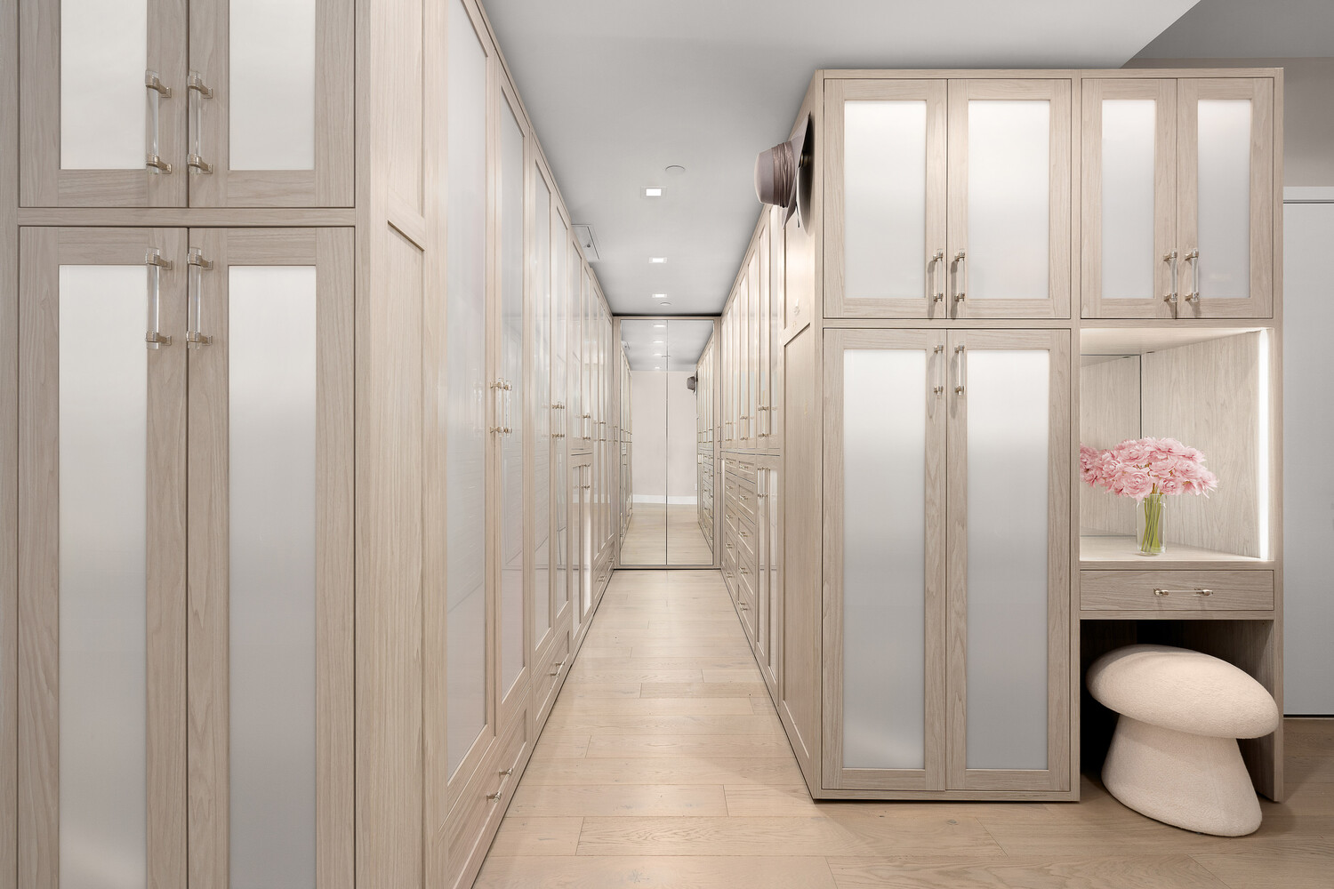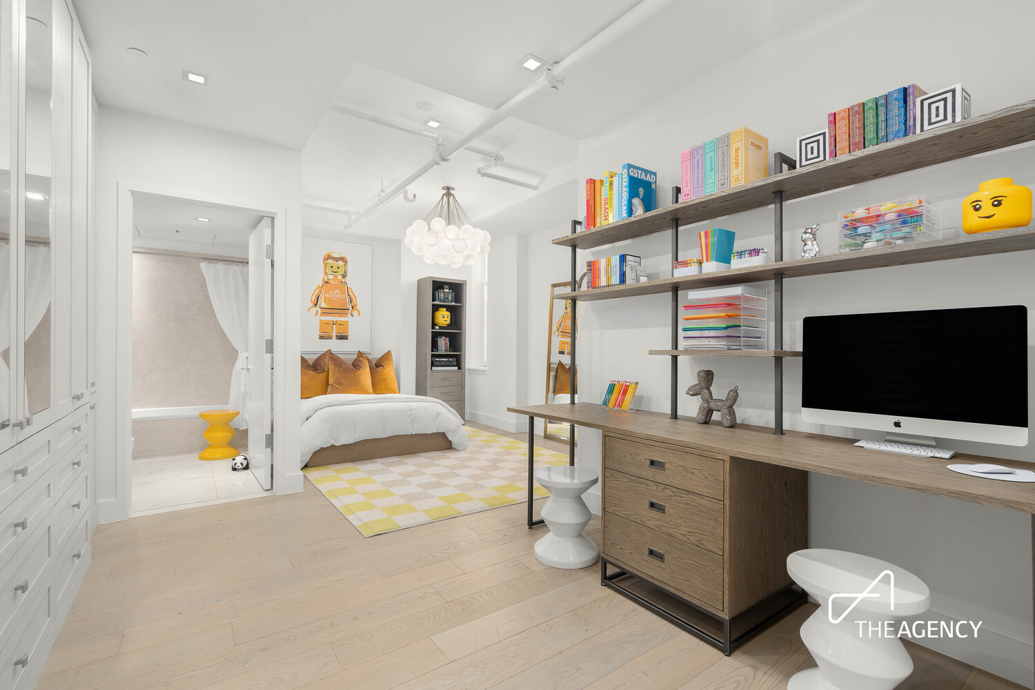 The south wing of the home allows for individual privacy on command by hosting 3 Bedrooms and 3 full bathrooms (the den is currently configured as a 3rd bedroom). Uncover the sanctuary of wellbeing that is the primary bedroom where everything is perfectly proportioned in beauty and balance. The sleeping quarters are built for an Alaskan King Bed plus a full lounge, while the adjacent custom dressing room by California Closets adorned in Ash Wood is the pinnacle of achievement for a young Carrie Bradshaw. The 5-piece ensuite bathroom is a zen master's workshop with separate shower, sculptural freestanding deep soaking tub, all enveloped in natural stone and crowned by a Carrara slab marble topped shagreen double vanity.