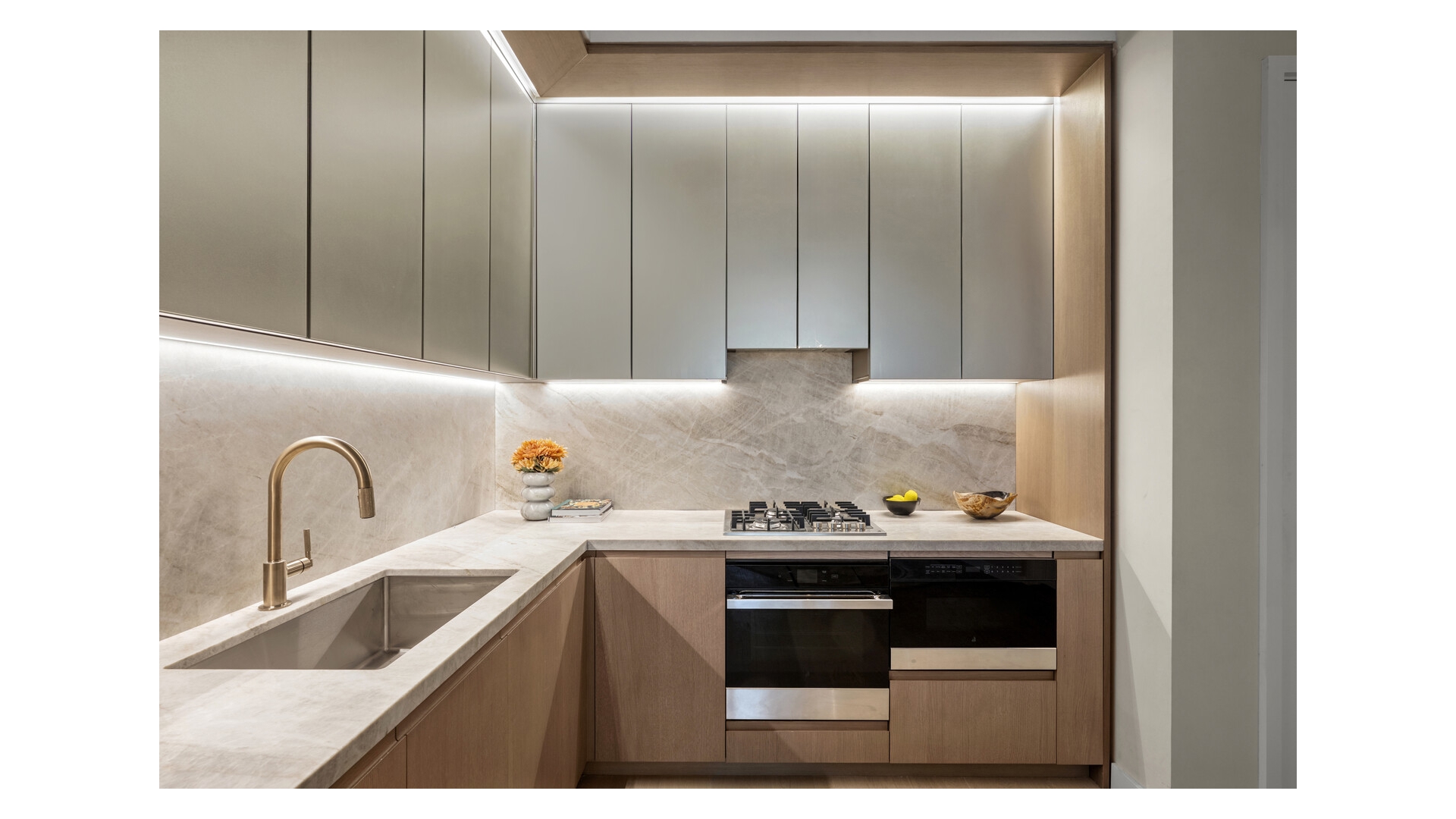 The bedroom is quietly positioned and scaled for comfort, while the bathroom is finished in natural, tactile materials-highlighted by a custom White Oak vanity with integrated lighting, Taj Mahal quartzite countertops, a soaking tub set beneath a rain showerhead, and Brizo fixtures in brushed Luxe Gold.