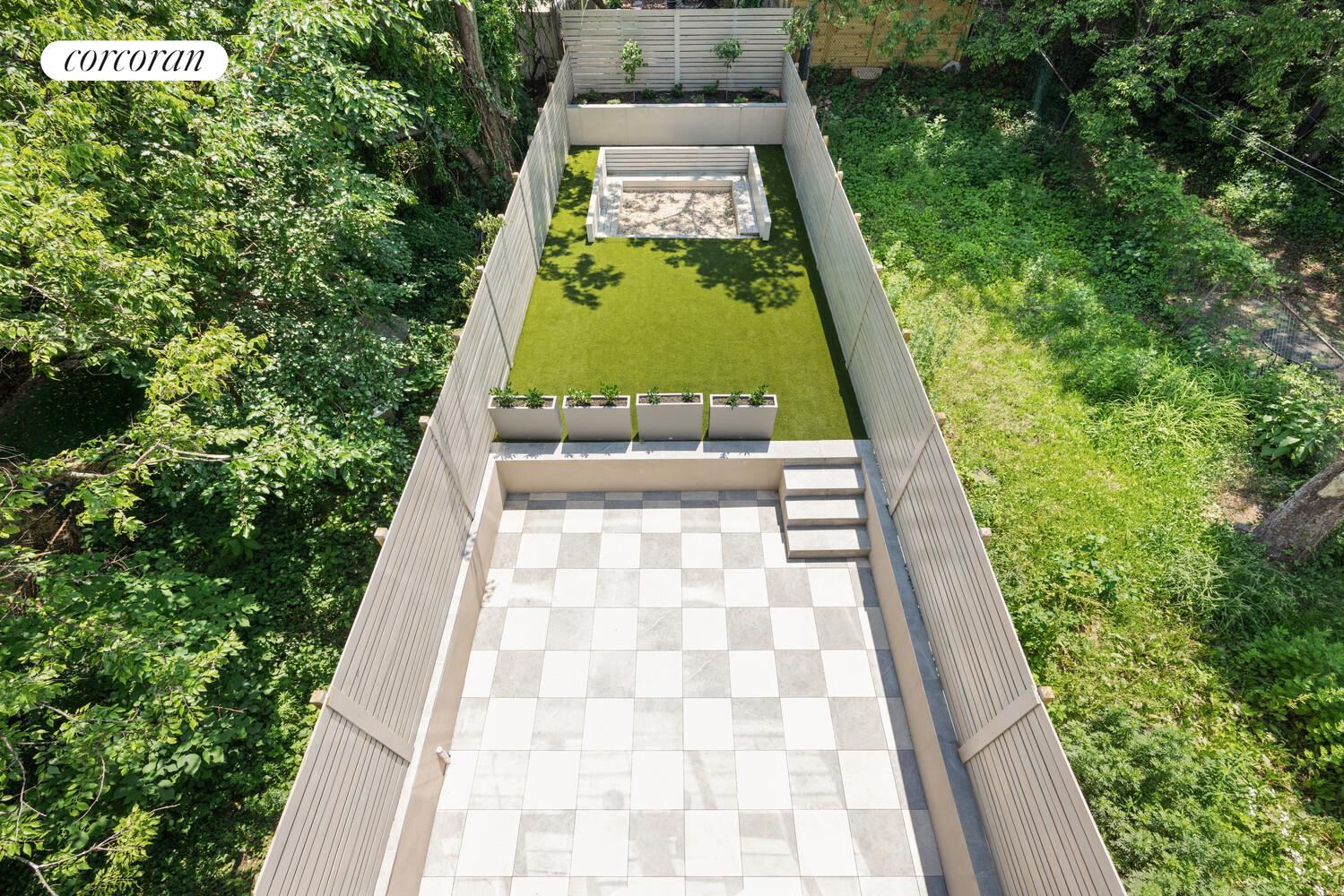 Natural light floods the kitchen through a dramatic double-height wall of windows that stretches from the floor, past the mezzanine of the great room, to the top of the second floor. A striking pendant light and open mezzanine enhance the sense of volume. Even more impressive, the kitchen opens directly to the large backyard with a sunken seating area-currently all the rage according to Architectural Digest. A built-in fire pit, pre-wired speakers, electrical outlets, and a water spigot make this outdoor oasis the retreat you need.