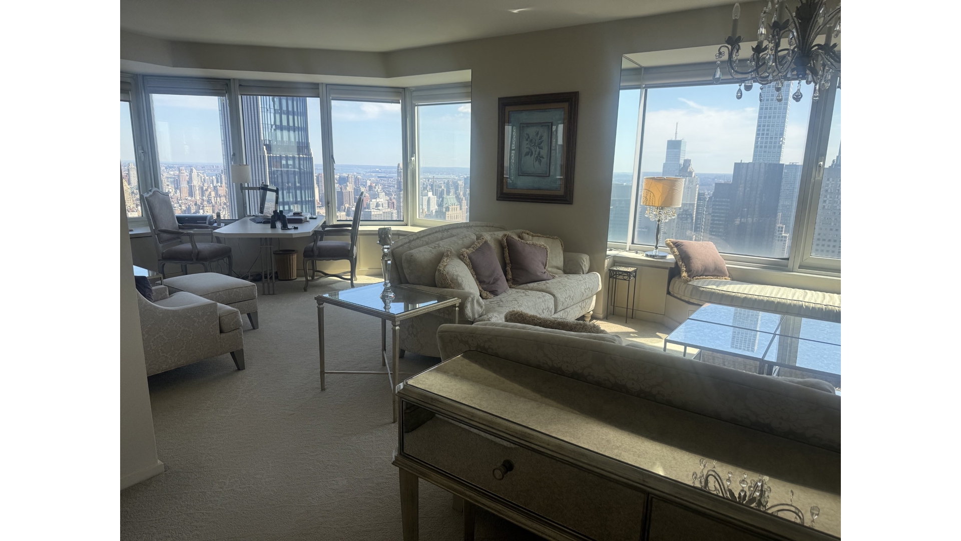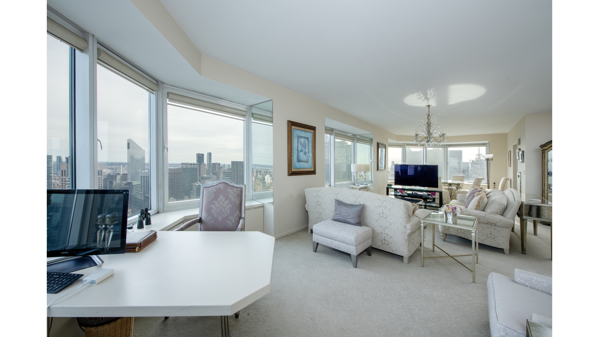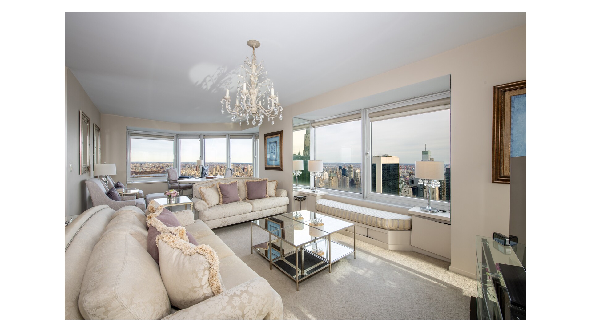 The best line in the bldg. on a very high floor!! Amazing Central Park and City views from this 1600 sq.ft. dramatic and gracious 2 bedroom, 2.5 baths condominium in the heart of Midtown West. The apartment is located on the 61st floor overlooking Central Park and Hudson River which is spectacular. The foyer-gallery leads to a 44 ft open Living and Dining Room with floor -to-ceiling windows. The apartment is in excellent condition with split bedrooms facing North, South and West. Both Bedrooms have marbled baths en-suite and there is a powder room off the main hallway. The kitchen is adjacent to the dining area. Cityspire is located in one of the most coveted neighborhoods. Fifth Avenue, The Plaza, Central Park, Time Warner and Lincoln Center are steps away. Cityspire is a full service and amenity rich condominium offering 24 hour doorman/concierge services, a fitness room, pool, Sauna, playroom, conference room, and garage in building. Pet friendly. Washer/Dryer on each floor. One-of-a kind apartment! A must see!