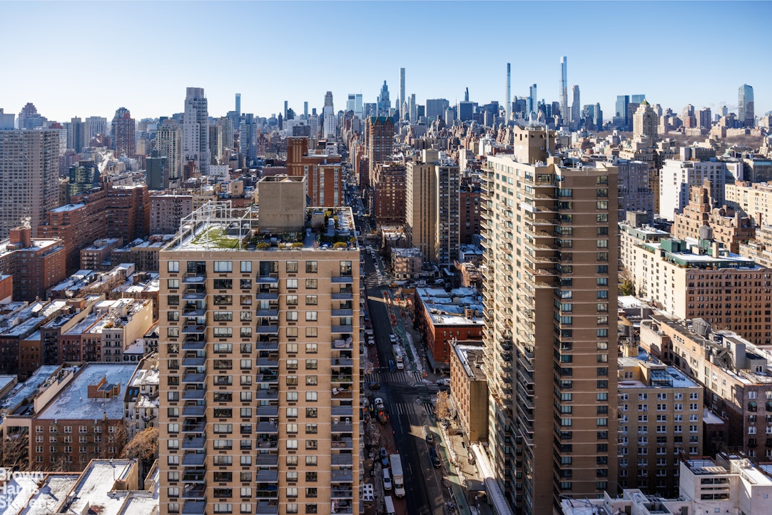 The primary suite is a serene retreat, tucked away from the main living areas with bright southern and eastern exposures, including the East River and beyond and miles downtown. A huge walk-in closet, and two more large closets provide very generous storage, while the five-fixture marble-clad bathroom boasts heated floors, a windowed rain shower with fabulous downtown views, a deep soaking tub, a separate water closet, and dual medicine cabinets above a light oak and marble vanity. Both additional bedrooms feature huge open views, large closets and en-suite marble bathrooms, with Kohler and Waterworks fixtures.