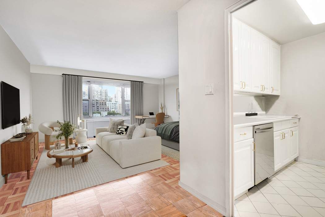 • Perched on the 11th floor, this extra-large alcove studio offers a rare combination of light, views, and intelligent design. Oversized north-facing windows flood the home with natural light and showcase an open city vista a beautiful perspective that captures the energy of Midtown while remaining calm and private above it all. The layout is exceptionally functional, with a clear separation between the sleeping and living areas that makes the space feel open and comfortable. The galley kitchen features generous cabinet storage, a gas range, microwave, and dishwasher, while the tiled bathroom and large closet provide practicality and ease of living. Beautiful hardwood floors tie the space together with warmth and continuity. Residents enjoy the benefits of a full-service condominium with a 24-hour doorman, elevator, laundry room, roof deck, and on-site garage. Ideally located near Bloomingdale’s, Whole Foods, Central Park, and some of the city’s best restaurants, shopping, and entertainment. Major subway lines (4/5/6/N/Q/R/W/F) and the Roosevelt Island Tram are just moments away, offering unmatched convenience.