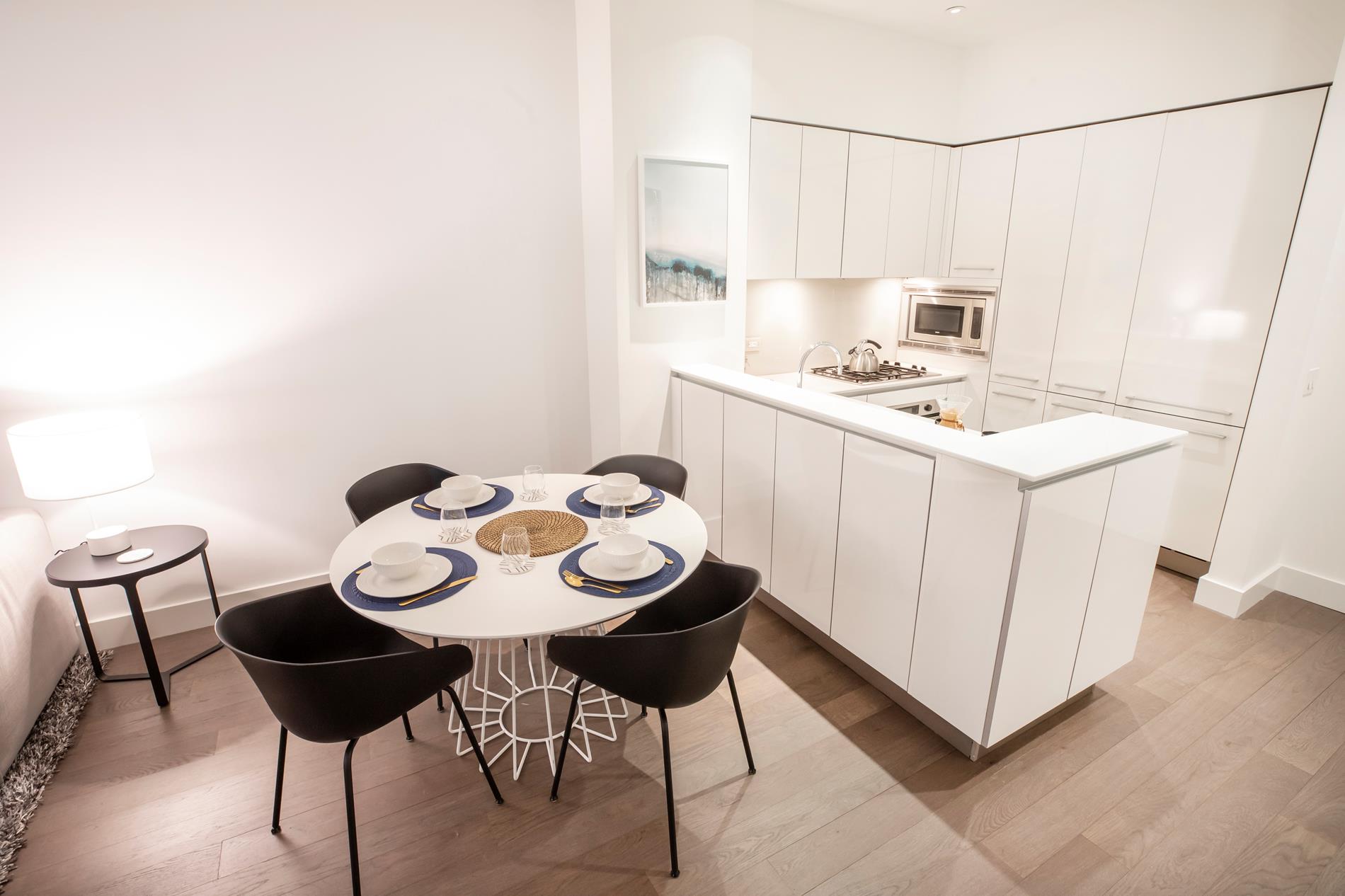 Residence 17P spans over 855 square feet, with premium hardwood floors and soaring 10'ceilings. The open kitchen features stainless steel Bosch appliances, Caesarstone countertops, and a built-in Lazza crystallized breakfast bar. Sleek Poliform cabinetry adds a touch of elegance while providing extra storage, seamlessly integrating a full-size Liebherr refrigerator, Miele dishwasher, and an in-unit washer and dryer. The kitchen's modern design perfectly blends style and functionality, creating an ideal space for both everyday living and entertaining.
