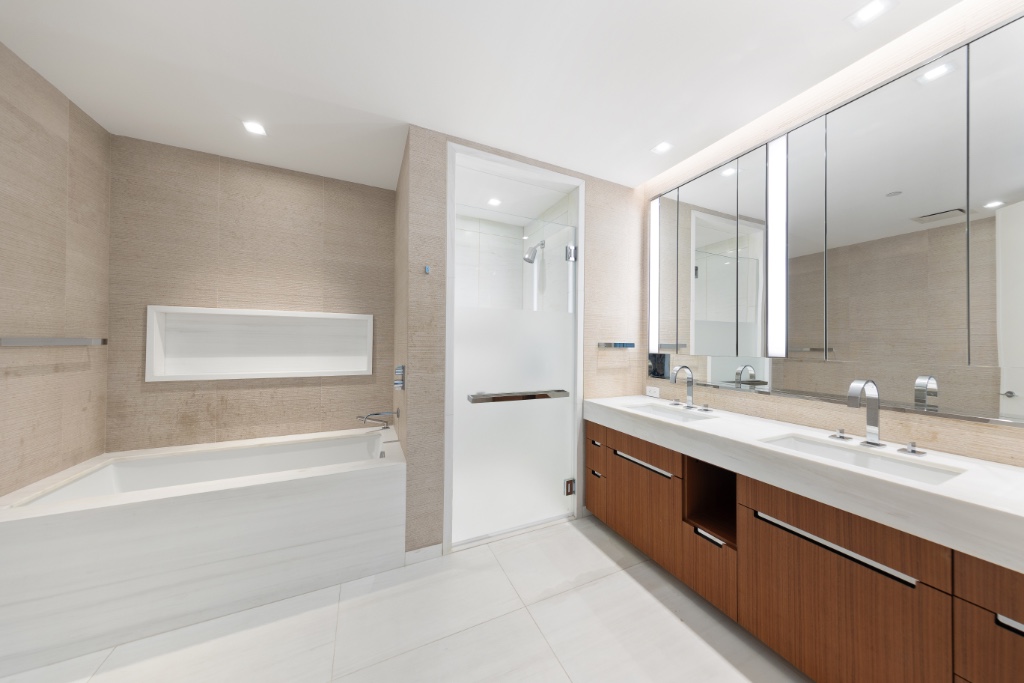 The primary bedroom has an ensuite marble bathroom with a soaking tub, a separate shower, and heated marble floors. The second bedroom also has an ensuite marble bathroom. A beautiful powder room is located in the hallway for guests.