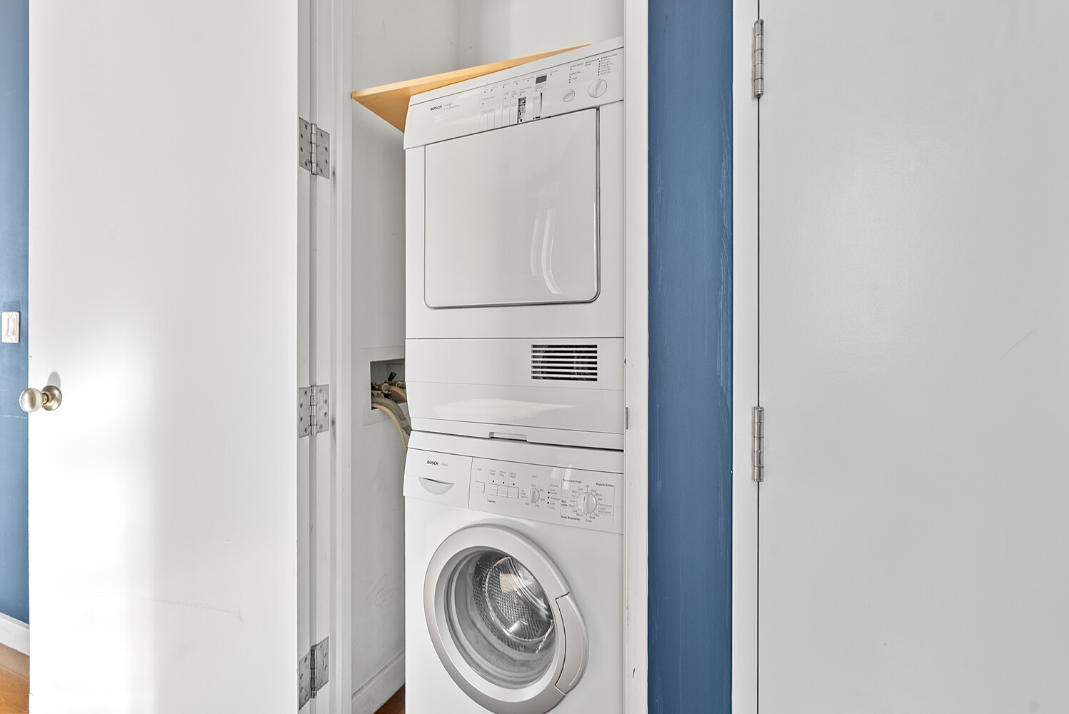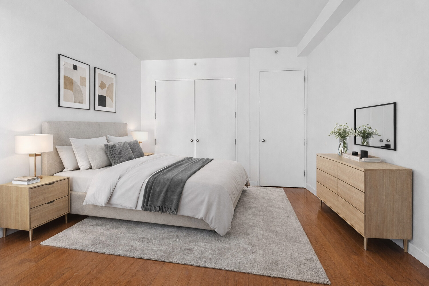 The large primary bedroom offers excellent closet space and direct access to the private balcony, creating a peaceful retreat above the city.