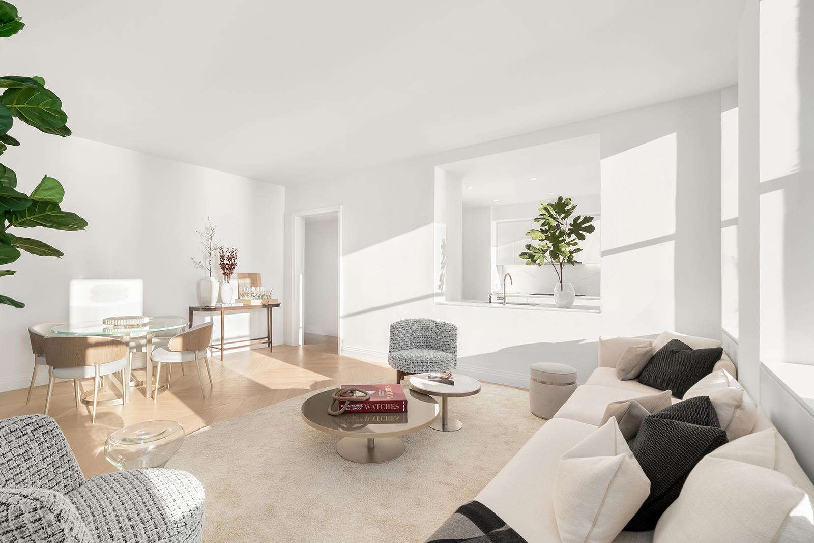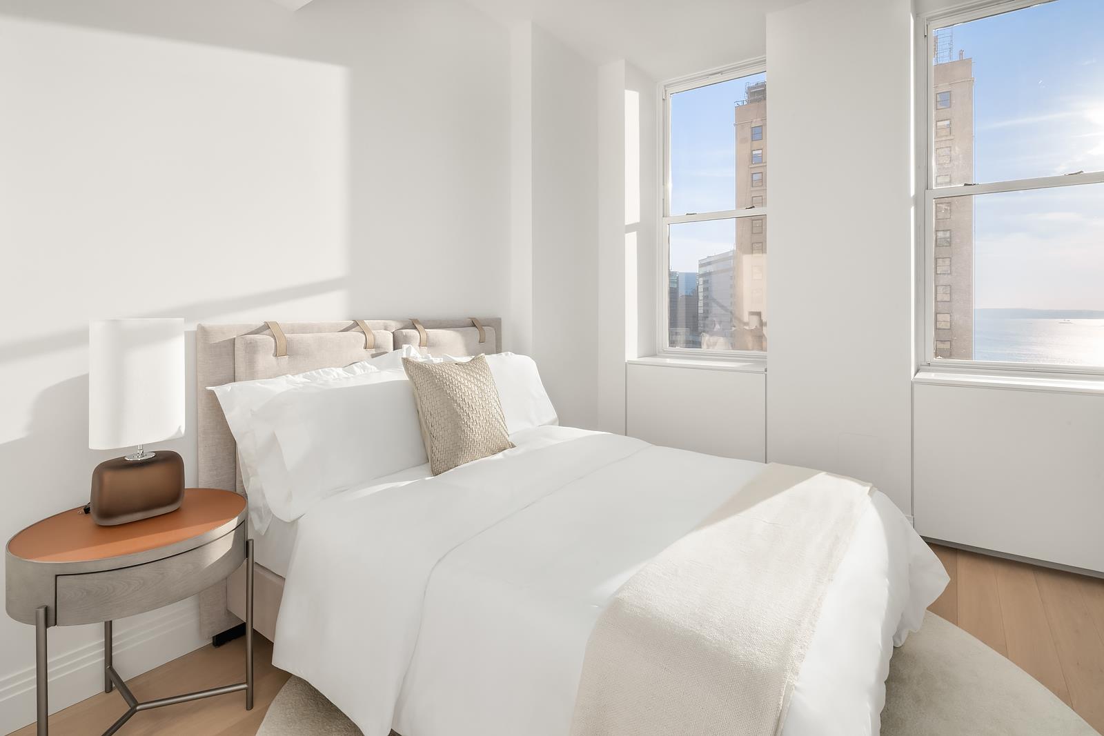 Warm stone primary bathrooms feature stall showers with thermostatic controls. Mirrored medicine cabinets are integrated with LED lighting and Bianco Dolomite marble surround. The building’s one-of-a-kind residences maintain the integrity and character of the 1930s scale, a modern take to art deco detailing, and boast ceiling heights over ten feet throughout with wide-plank French Oak hardwood floors underfoot.