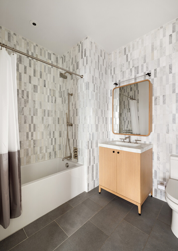 The king-sized primary suite features views into Downtown Brooklyn and features a large walk-in closet as well as a luxurious, five-fixture en-suite bath outfitted with radiant heated marble floors, custom Waterworks fixtures, a large double vanity with drawer and medicine cabinet storage, and deep soaking tub and spacious rain shower. The 2nd bedroom faces East, with sunrise views over the Navy Yard and enough space for a king-sized bed if desired.