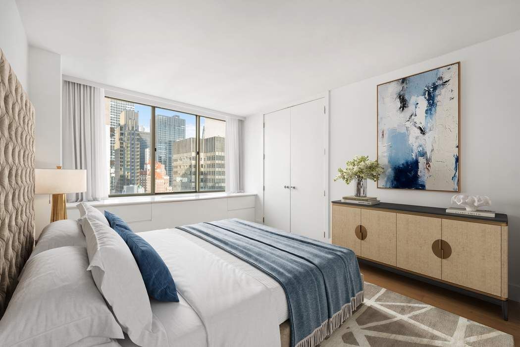 • An increasingly rare opportunity is now offered at The Club at Turtle Bay: a high-floor two-bedroom, two-bath residence with open, sun-filled Midtown views and a highly functional corner layout. This home presents a compelling combination of space, light, and thoughtful upgrades in a well-established full-service condominium. The apartment features hardwood flooring, upgraded double-paned windows, and lighting throughout—meaningful improvements that enhance comfort and energy efficiency. The windowed kitchen offers premium appliances, including a Liebherr refrigerator, Viking four-burner range, and Miele dishwasher, paired with marble countertops, for a truly beautiful kitchen. Both bathrooms have been updated with clean, contemporary finishes and imported Brazilian tile. The corner layout with winged bedrooms allows for flexibility and privacy, ideal for a variety of living arrangements including guests or a home office. The generously proportioned living room comfortably accommodates both living and dining areas, offering excellent usability and scale. A Miele washer and dryer in the apartment adds everyday convenience. There is a corner balcony right off the living room with open views. Built as a condominium in 1989, The Club at Turtle Bay is a full-service building with three elevators serving 173 residences across 40 floors. The building offers a comprehensive suite of amenities, including a 24-hour doorman, experienced live-in superintendent, a glass-enclosed rooftop residents’ lounge, and a landscaped roof deck with sweeping 360-degree city views. Additional conveniences include a central laundry room, on-site gym, and storage (subject to availability and fee.) Parking available underneath for an additional fee. Please note that while cats are allowed, dogs are not permitted. A well-located, high-floor condominium offering a sought-after corner layout, excellent light, and enduring value in one of Midtown Manhattan’s most convenient neighborhoods. Real estate taxes displayed may be reduced by 17.5% if purchasing as your primary residence (Consult your CPA). All measurements and square footages are approximate, and all information should be confirmed by customer. Please note: the apartment is currently vacant. There is a capital assessment of $159.60 per month.