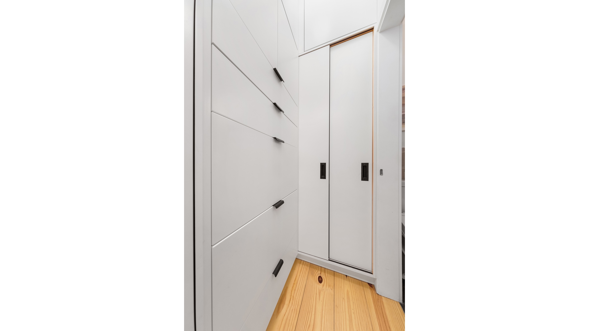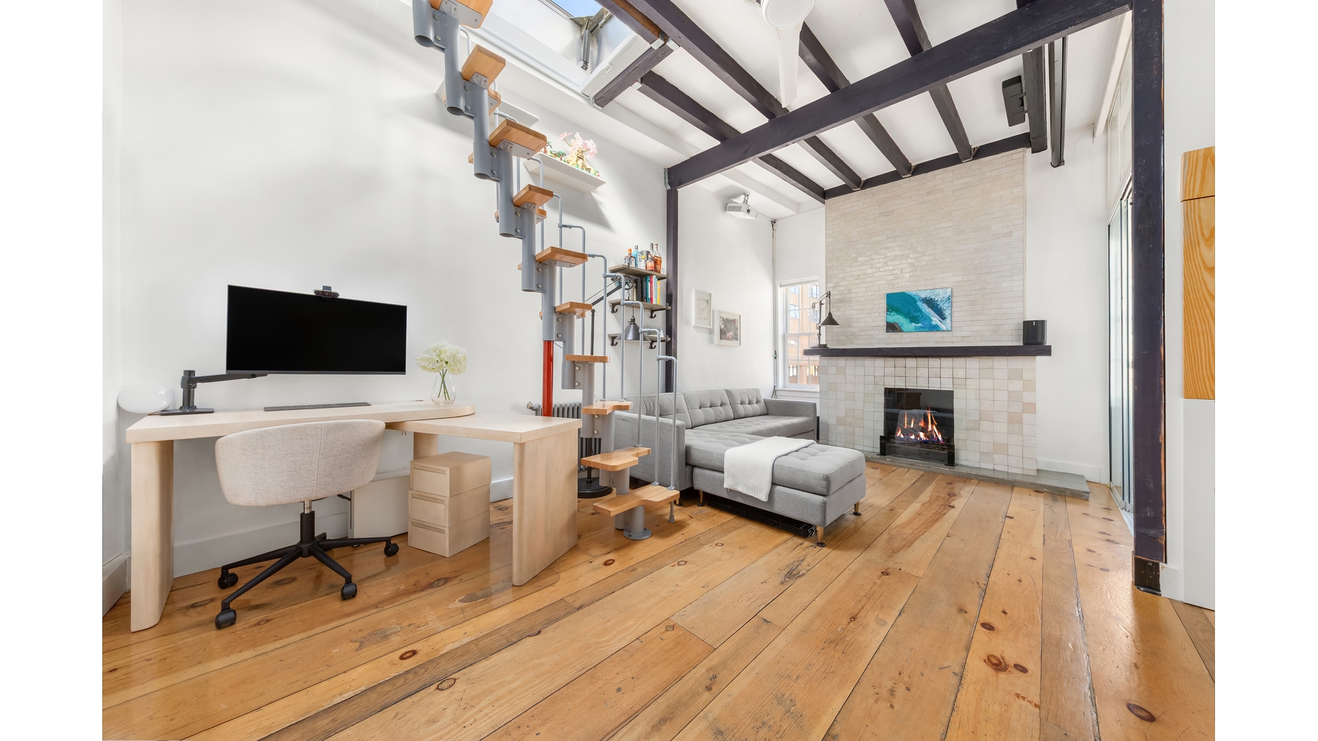 The home blends classic pre-war character with thoughtful modern upgrades. Architectural details include soaring 10-foot beamed ceilings, reclaimed hardwood floors, and a wood-burning fireplace framed by striking Moroccan tile. The gut-renovated kitchen is appointed with custom cabinetry and premium Fisher & Paykel and Bosch appliances, while the spa-inspired bathroom features slate tile flooring, a deep soaking tub, and a heated towel rack. A ceiling-height custom walk-in wardrobe provides impressive and efficient storage.
