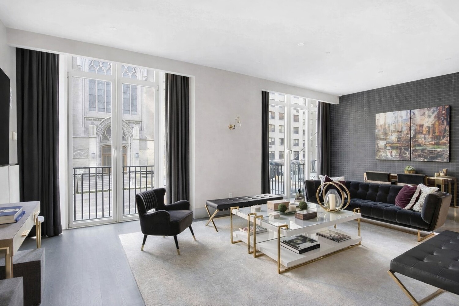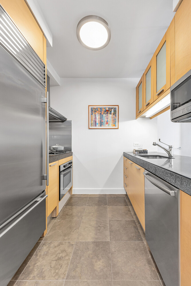 Oversized and quiet one bedroom designer residence with dramatic ten-foot-wide windows enjoys sweeping treetop and landmarked architectural city views across iconic double wide 79th Street. The 18 foot great room receives northern light and accommodates living and dining. The open chef's kitchen has honed granite counters, ceiling height cabinetry and premier stainless appliances, including a Sub-Zero refrigerator, Wolf gas range, Bosch dishwasher and microwave. A marble powder room is situated off the entrance gallery.