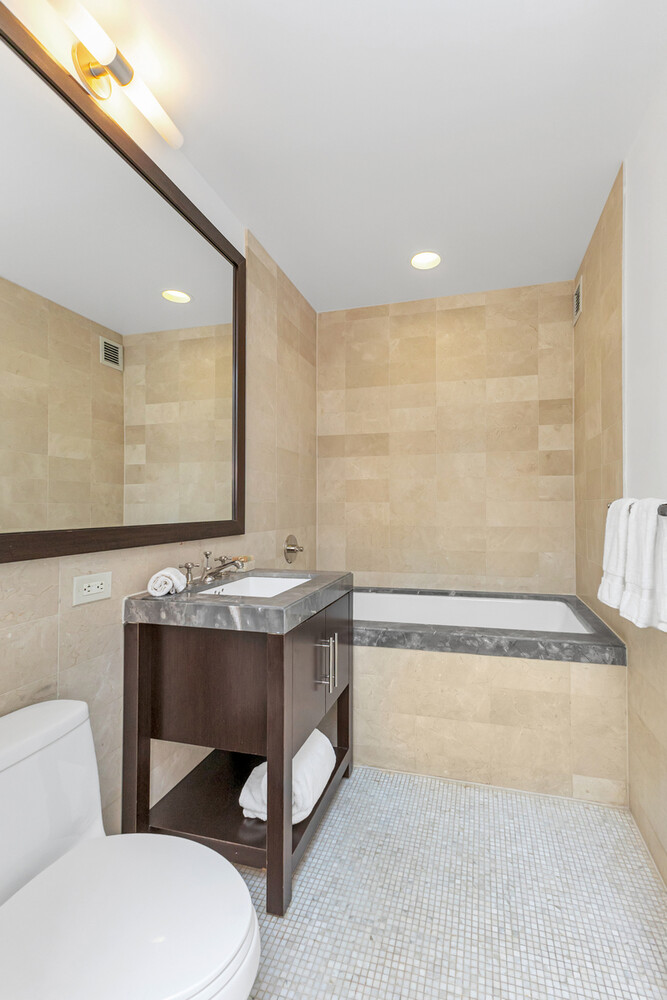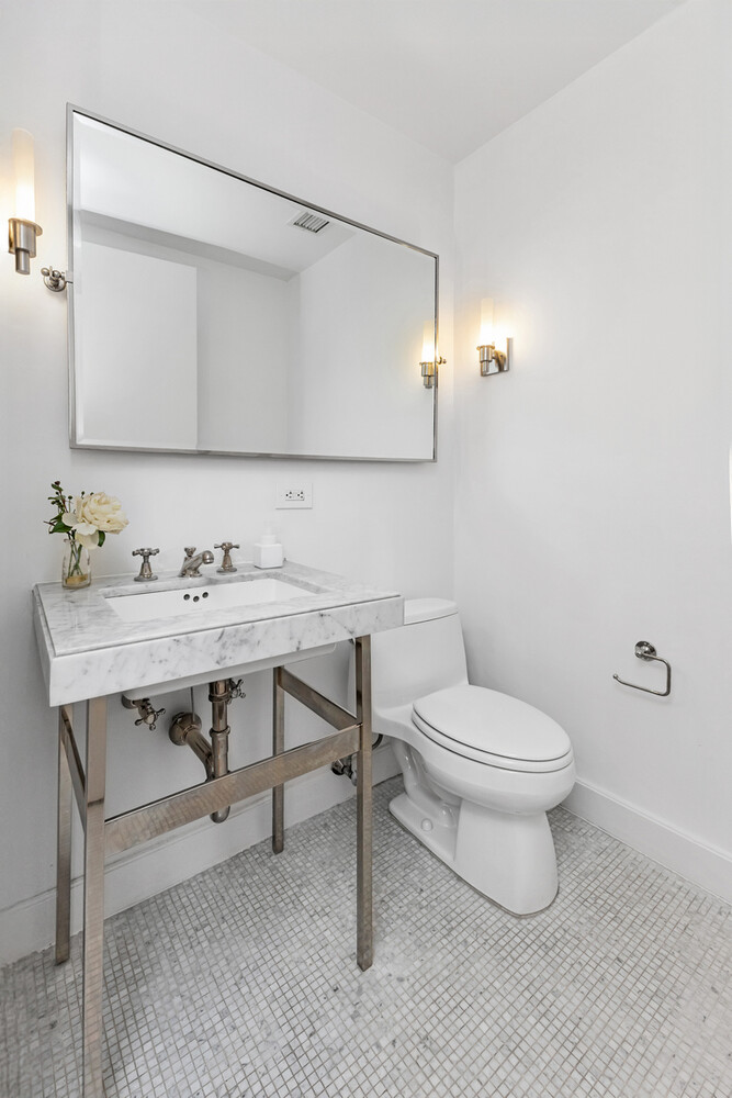 The bedroom is graciously sized, with a wall of windows and an expansive walk-in closet. The ensuite marble bath is outfitted with radiant heat floors and Waterworks and Kohler fixtures, with deep soaking tub and separate glass shower.