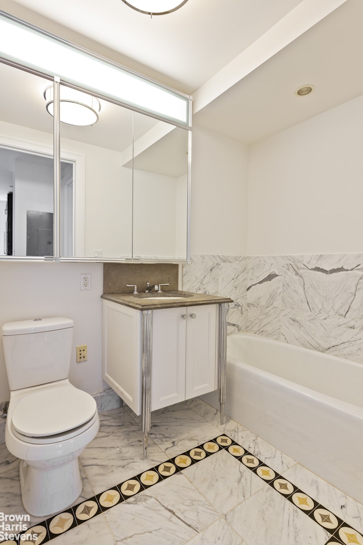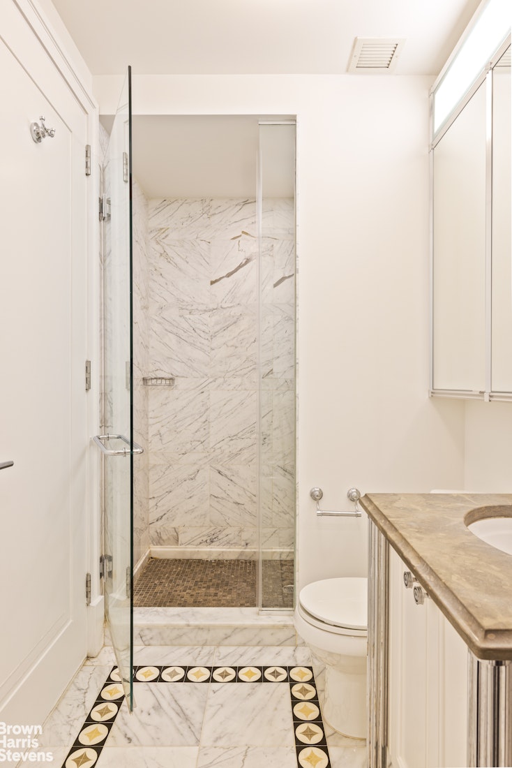 The spacious bedroom which includes a large walk-in closet with custom-built shelving, drawers and hanging rods. The sumptuous bathroom is designed with marble clad walls and vanities, and polished marble floors with intricate patterned stone borders. Large energy-efficient windows, high ceilings, herringbone oak wood floors, central air conditioning and a Miele washer/dryer are also included.