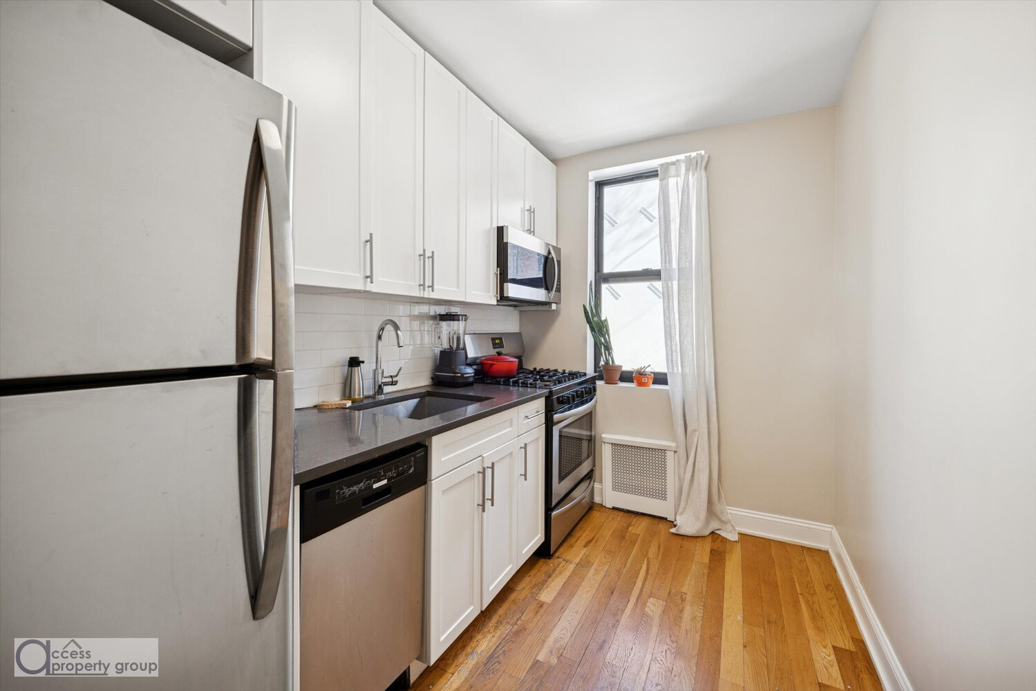 Beautiful morning light pours into the apartment, and because it's set away from the street, you'll enjoy a peaceful retreat from city noise. Throughout the home you'll find exquisite hardwood floors, an impressive five (!!) closets, and a generous dining foyer just off the living room-perfect for hosting dinners, game nights, or your next "I'll just make appetizers" gathering. The sleek kitchen shines with white shaker cabinetry, quartz countertops, a glass-tile backsplash, and stainless steel appliances (including a dishwasher and microwave!), and if you ever dreamed of an open kitchen, there's no better opportunity than this to make that a reality. The bathroom is a breath of fresh air, featuring crisp white subway tile, a chic grey accent wall, and modern fixtures-a welcome upgrade from the tired bathrooms you may have encountered along the way. As a cherry on the cake, walls and ceilings have a flawless finish, and all baseboards, light fixtures, door hardware, outlet covers, and switch plates have been replaced.