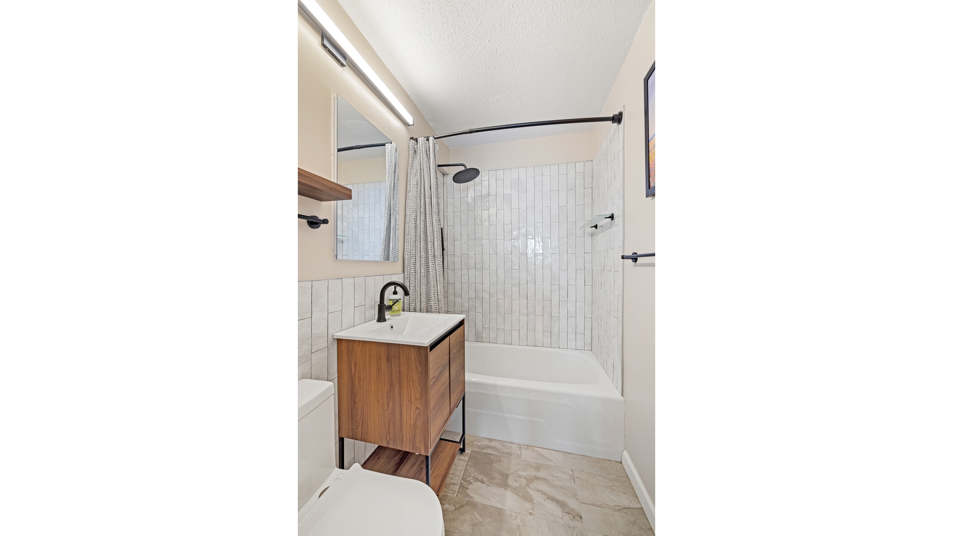 Custom shelving in the dressing area leads to an artfully designed & renovated bath with textured tiles, Artos shower system with rain head and separate hand held fixture, eco flush toilet, and recessed dual mirrored cabinet.