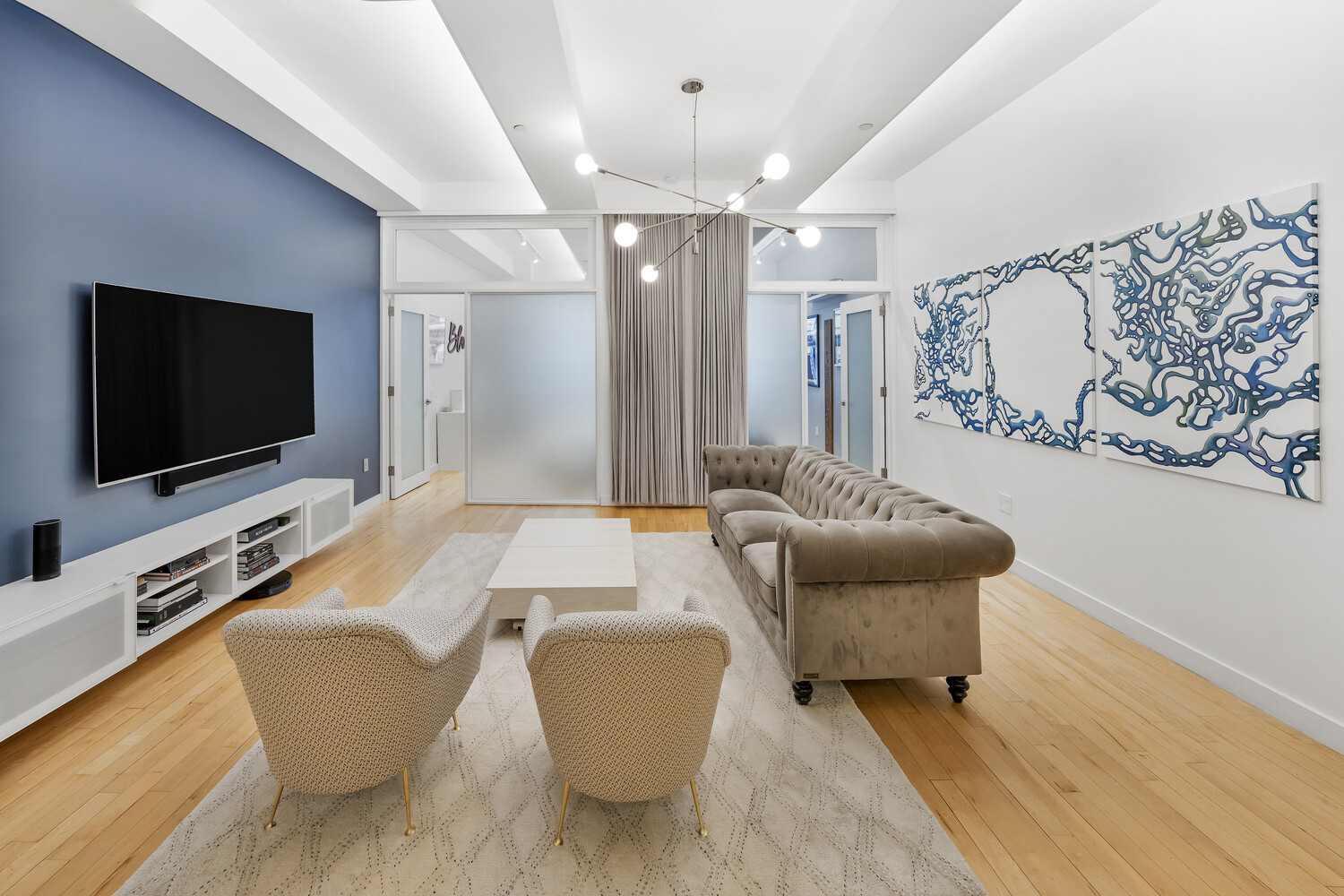 The apartment's design thoughtfully maximizes natural light, with glass enclosures for two of the bedrooms that allow sunlight to pour into the living space while maintaining privacy and architectural interest. The home features three bedrooms and two renovated bathrooms. The bathrooms are finished with custom made imported honed Thassos Greek marble tile - one bathroom with a standing shower and tons of additional storage and the other offering double vanity sinks, a soaking tub, and a separate standing shower. Impeccably designed storage throughout including custom built-ins and cleverly integrated lofted spaces makes this home as functional as it is beautiful. A rare opportunity to own a meticulously reimagined home that balances light, scale, and brilliant design. Two storage units are included - one is easily accessible on the 18th floor.