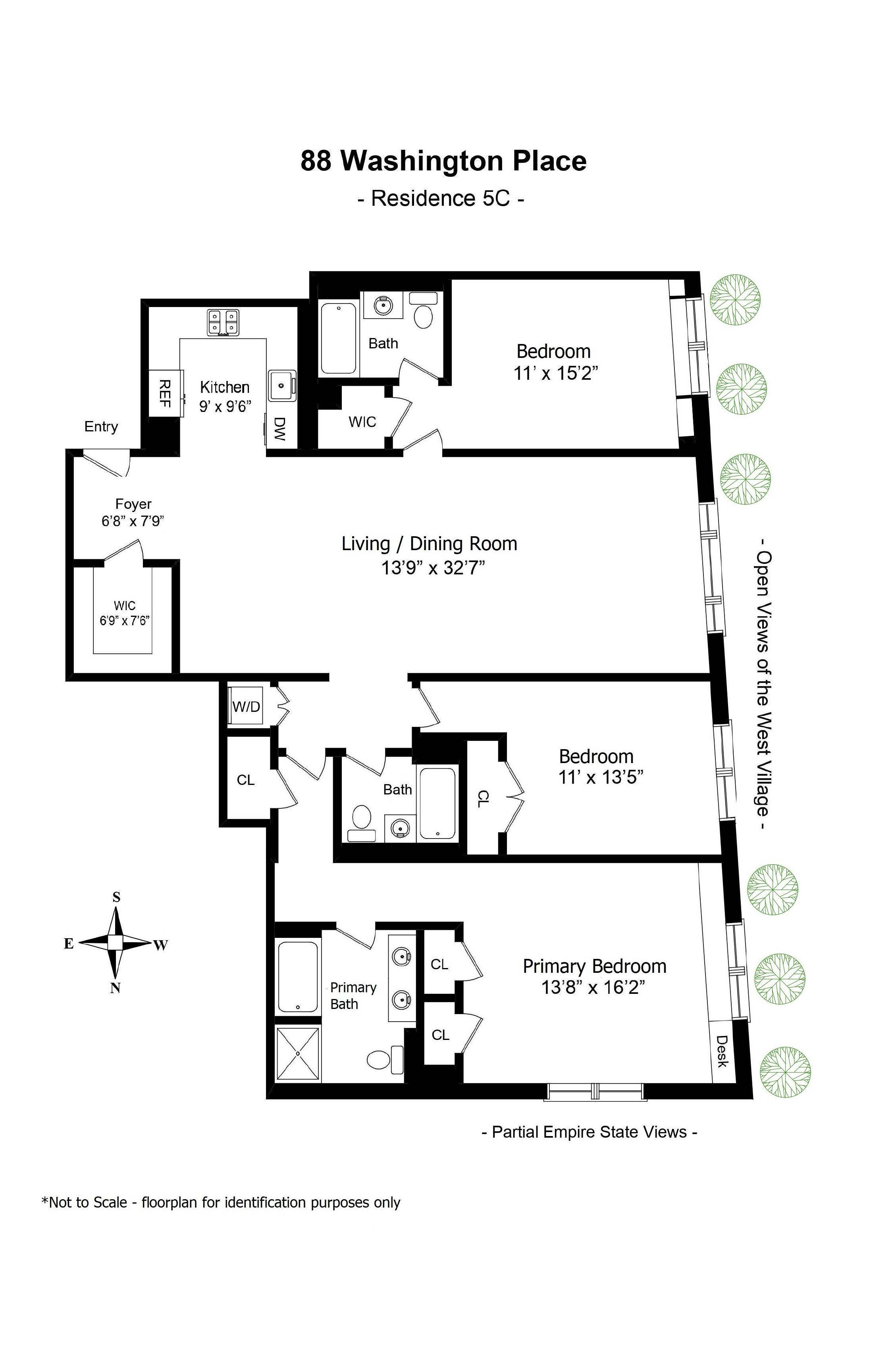 • **ALL APPOINTMENTS INCLUDING OPEN HOUSES REQUIRE AT LEAST 48 HOURS NOTICE. PRIME LOCATION. FULL-SERVICE CONDO. RENOVATED. LOW MONTHLIES. Your search ends here! Welcome home to Residence 5C at 88 Washington Place. Rarely available this extraordinary renovated 3-bedroom, 3-bathroom condominium is in the heart of the Greenwich Village, off of Washington Square Park and in one of the most desirable locations in all of downtown. This generous home offers space, luxury, privacy, and location. Welcomed by a 40" loft-like living room, your attention is immediately drawn to the 10" ceilings and impressive over-sized floor to ceiling windows facing directly west. The views are open & bright and the expansive windows serve as a picture frame, overlooking Sheridan Square & the West Village. All your needs have been considered in this beautifully crafted home, where the current owners have added elements of sophistication and charm. The renovated pristine kitchen features natural stone counter tops, a Wolf cook-top & oven, Subzero Refrigerator, microwave, and Miele dishwasher. Directly off the kitchen you also have ample space for an 8-person dining set. Entertaining has never been easier or more fun! Away from the living area, the over-sized private primary suite enjoys partial views of the Empire State Building and it makes for the perfect retreat for relaxation. The master bath is outfitted with Grohe fixtures, a deep soaking tub, and floor-to-ceiling stone tiling. The double vanity and glass enclosed shower allow two or more people to easily share the space. The apartment features two more very generous sized bedrooms and bathrooms. The high 10’ ceilings and expansive west facing windows throughout this beautiful home exudes warmth, air, and light to every room. Residence 5C has an abundant amount of storage and offers three large custom walk-in closets, providing efficient use of space and function, in addition, this residence also transfers with a deeded private storage unit. The home also features a Bosch washer and dryer, electric blinds, and central AC. 88 Washington Place is a luxury six floor boutique condominium with a collection of 14 private residences. Featuring unparalleled amenities such as a 24-hour virtual doorman, a gym / fitness room, attentive full-time super, private locked storage, resident garden with gas BBQ grills. Owners at 88 Washington Place also enjoy low monthly common charges. Not to be missed! *Capital assessment of $102.80 through December 2026. **The real estate taxes reflect the 17.5% condominium & cooperative tax abatement for primary residents. More information can be found here: https://www1.nyc.gov/site/finance/benefits/landlords-coop-condo.page