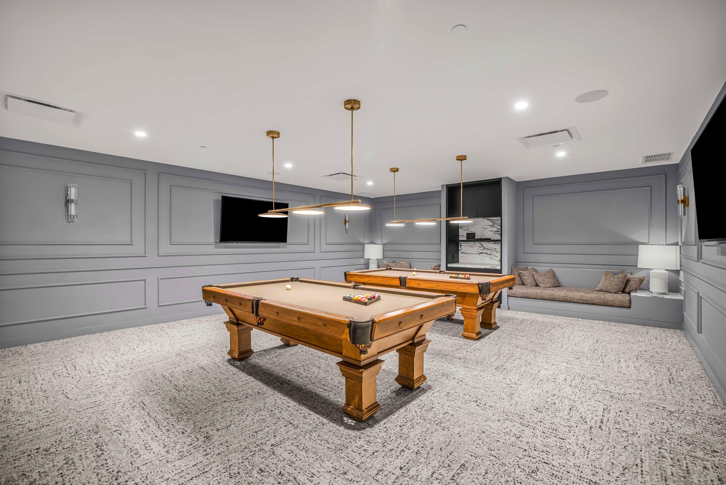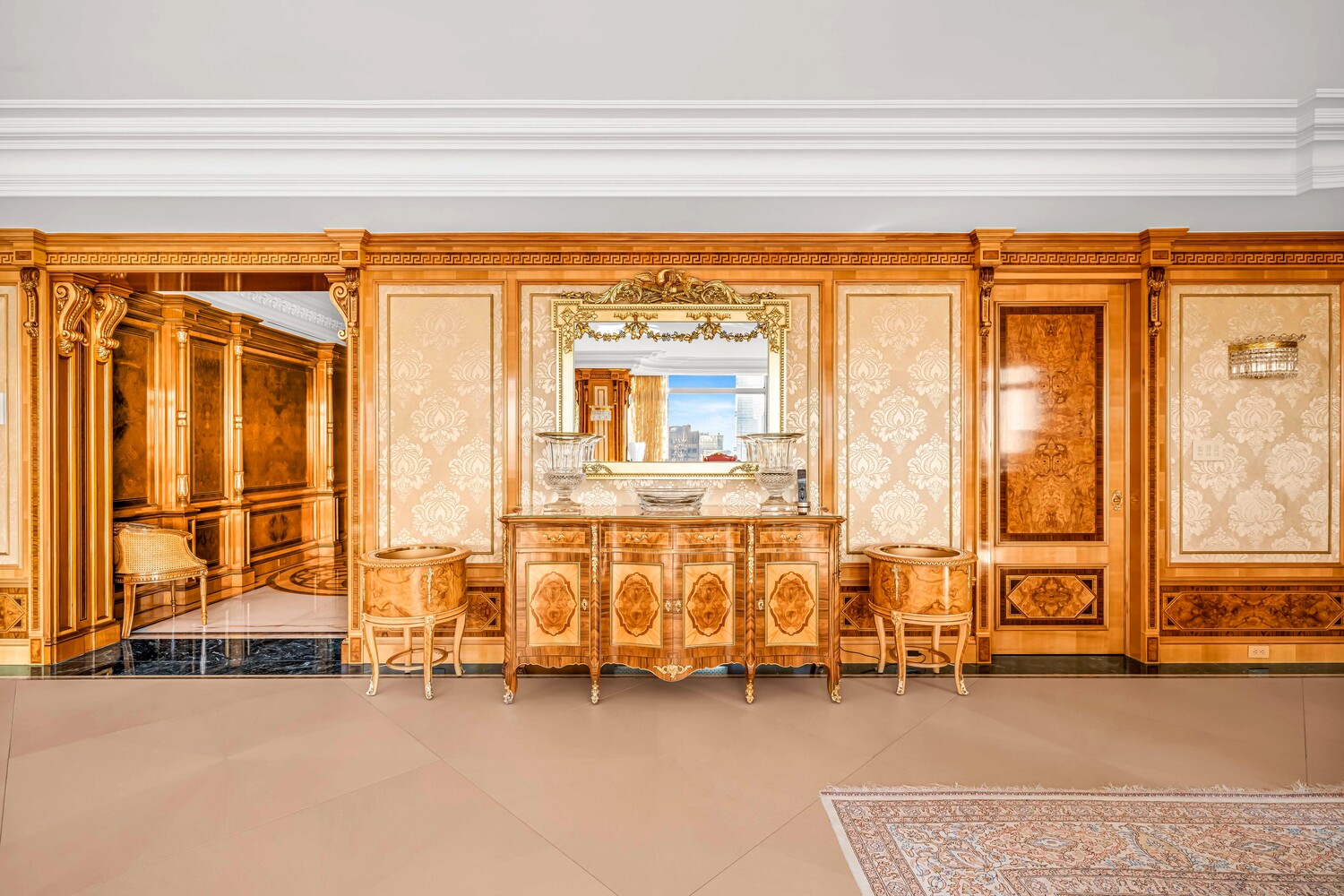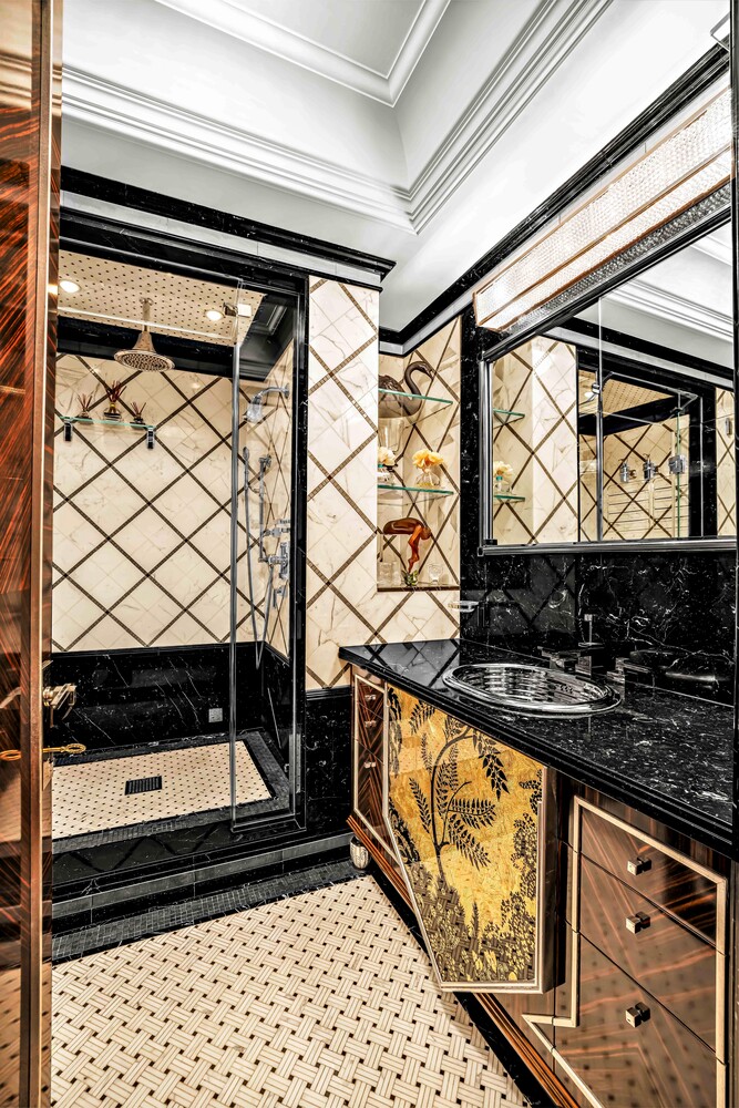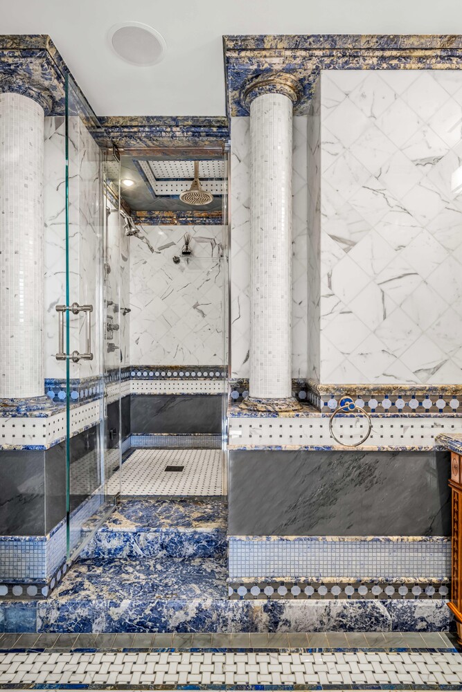 Each bathroom is a work of art in its own right-one is enveloped in alabaster, another features rare amethyst sourced from Tanzania, while the others showcase stunning onyx and lapis lazuli, creating a one-of-a-kind living experience. Adding to the grandeur, stunning Baccarat chandeliers illuminate the space, casting a warm, opulent glow that enhances the home's timeless elegance.