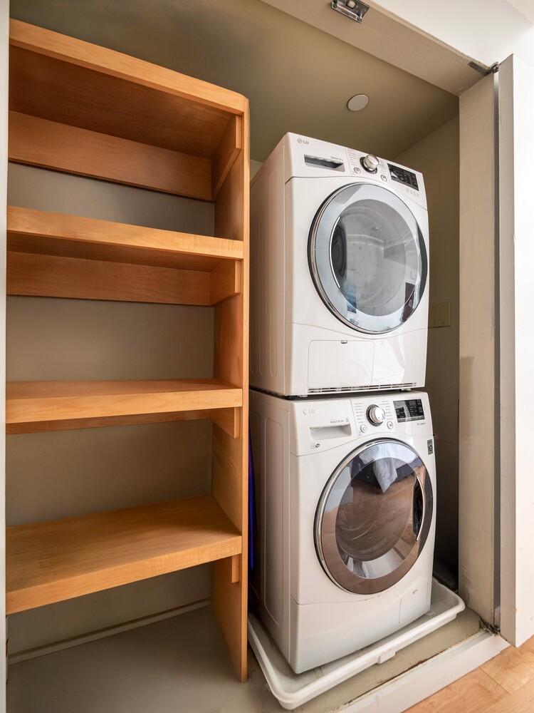 The sleek kitchen is equipped with gray cabinetry, stainless steel appliances, dishwasher, and stone countertops. Additional highlights include in-unit washer and dryer and a modern bath with clean, neutral finishes.