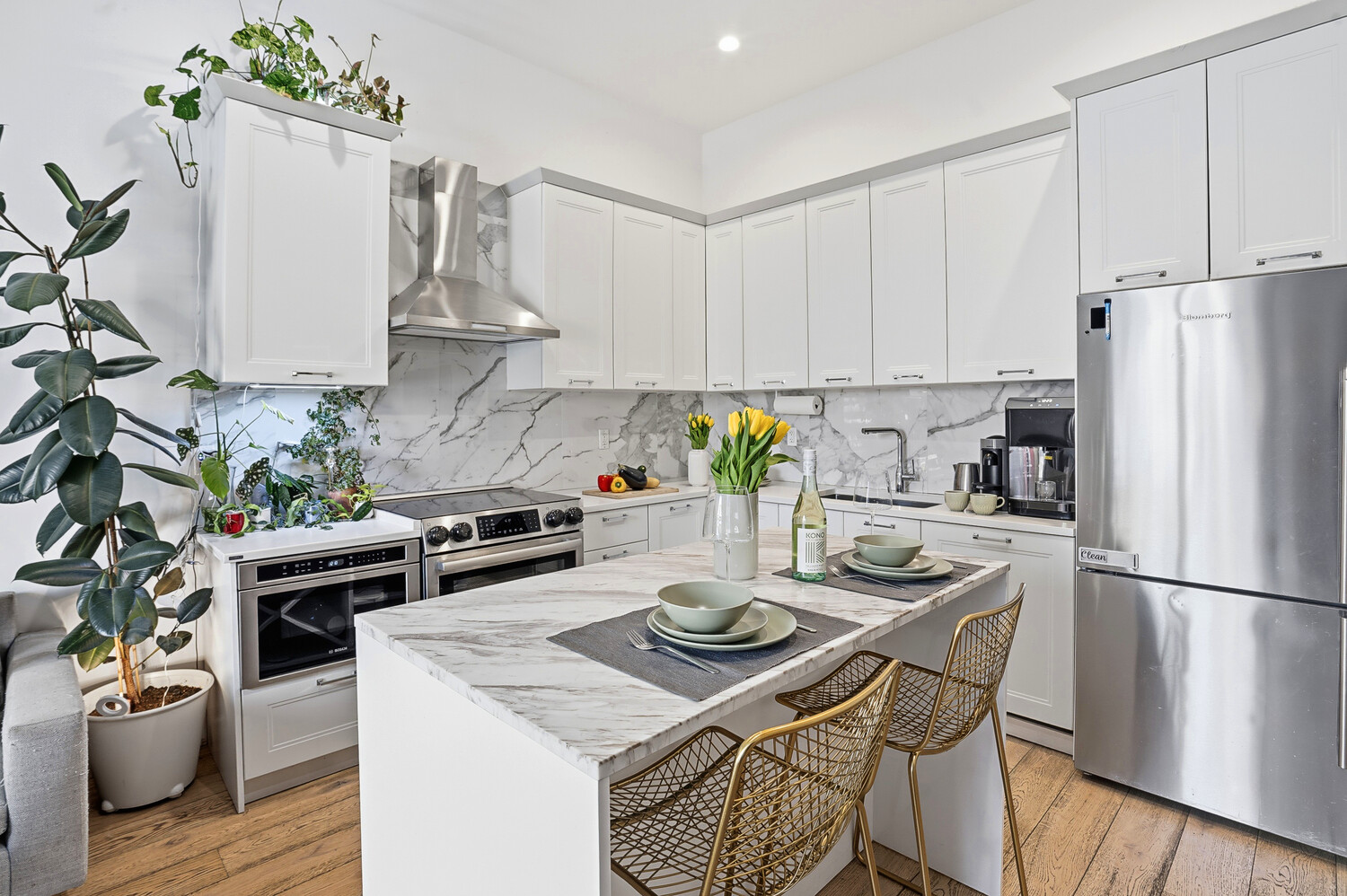 The kitchen is tailored for serious cooking and gathering, with generous workspace, refined finishes, and a layout that keeps the host connected to both living and backyard spaces.