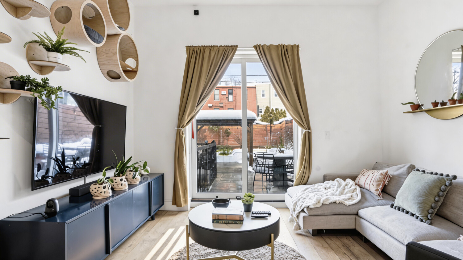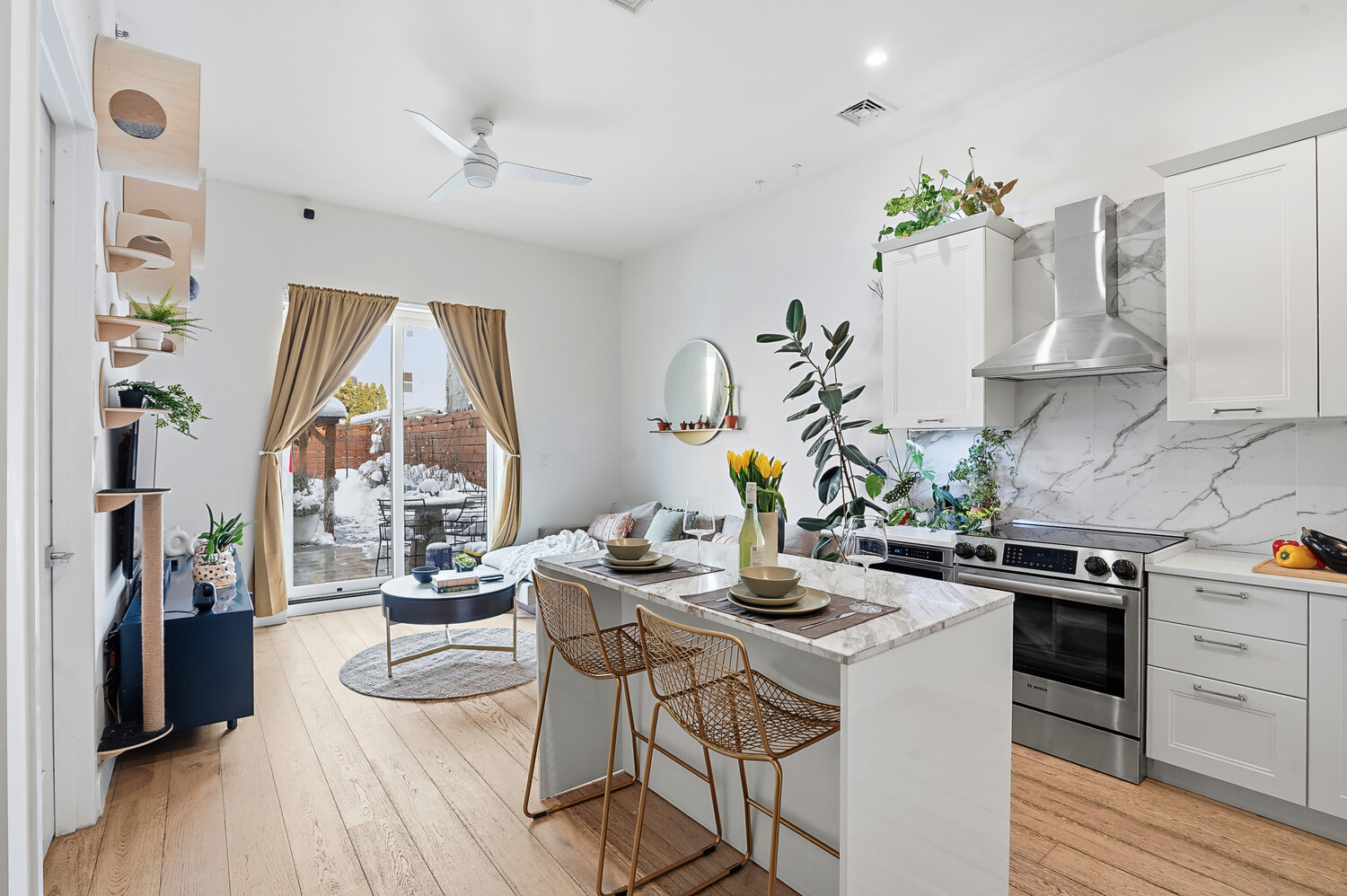 The main floor unfolds with striking ceiling height and oversized industrial-style windows that draw in soft, all-day light and frame views of your expansive private garden. The open living and dining area flows naturally to the outdoors, creating an effortless indoor-outdoor experience rarely found in Brooklyn apartments.
