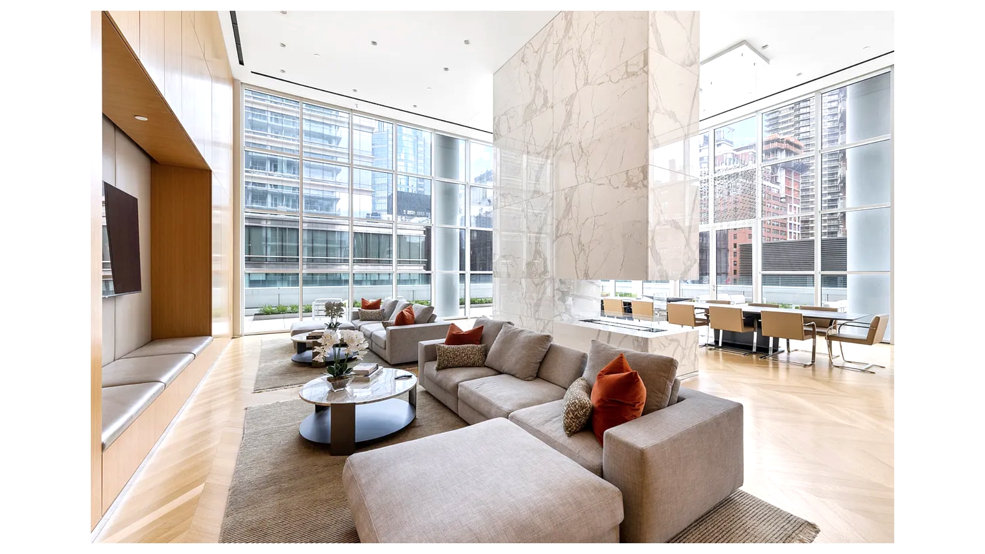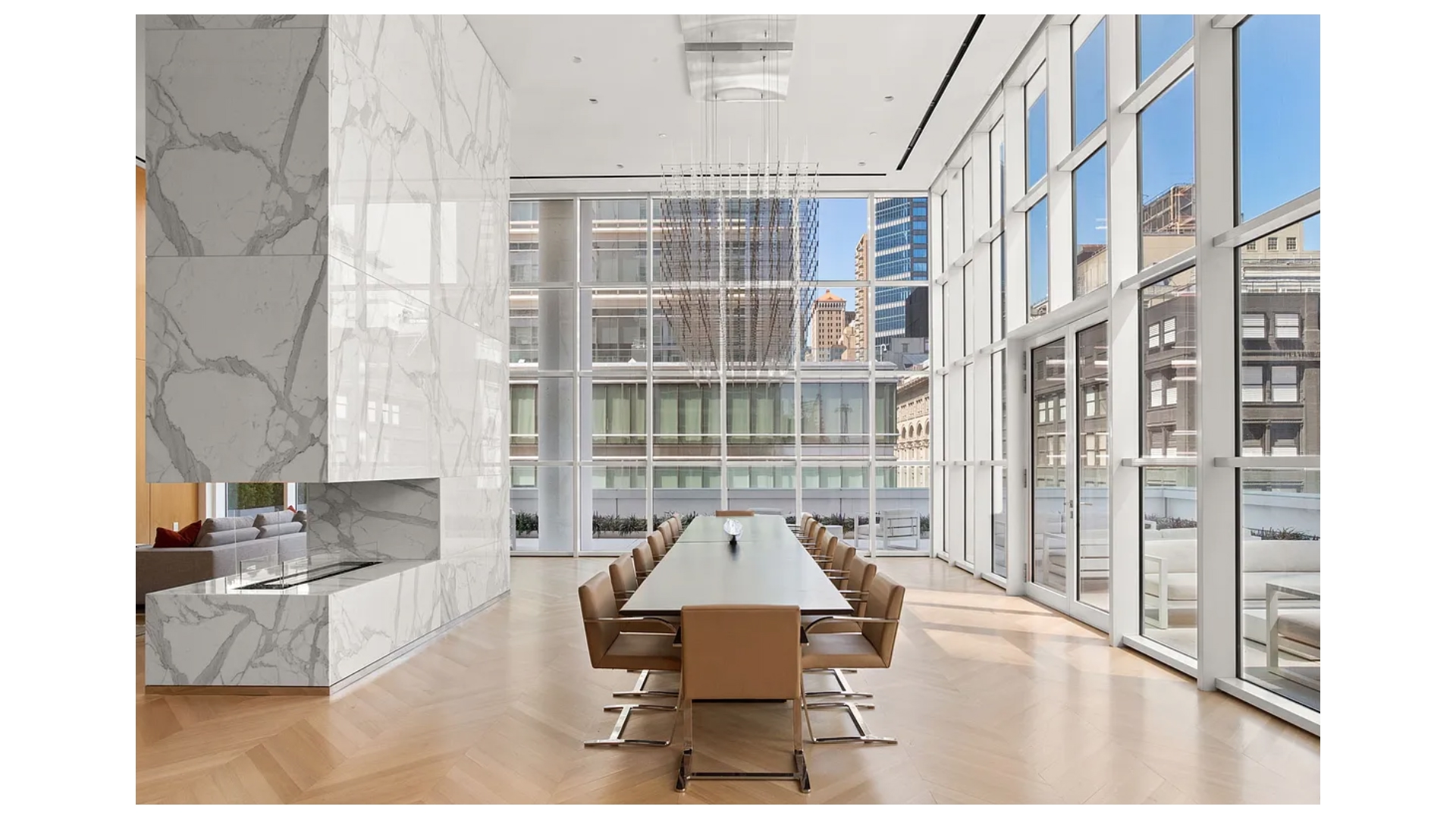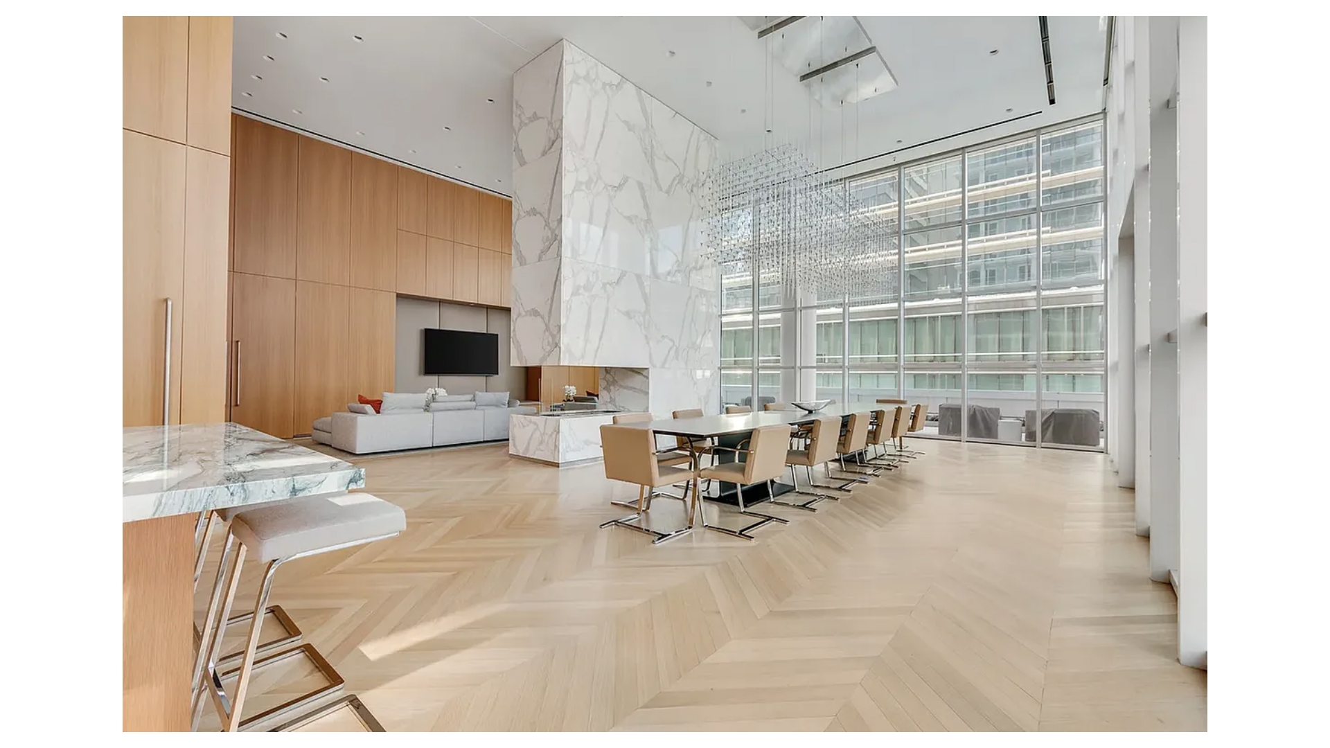 This outstanding 835 square foot one-bedroom, one and a half bath light-filled corner residence features 22 linear feet of terrace space with exposures to the south and west. The floor-to-ceiling glass windows and expansive 10' ceilings tie the inside/out living concept together perfectly. The 144 square foot terrace seamlessly connects the great room to an open kitchen outfitted with Italian white glass and aluminum trim cabinetry by Aran Cuchine, book matched honed Calacatta marble slab countertops, full-height backsplashes, and integrated Brilliant White glass appliances by Miele including an integrated wine refrigerator.