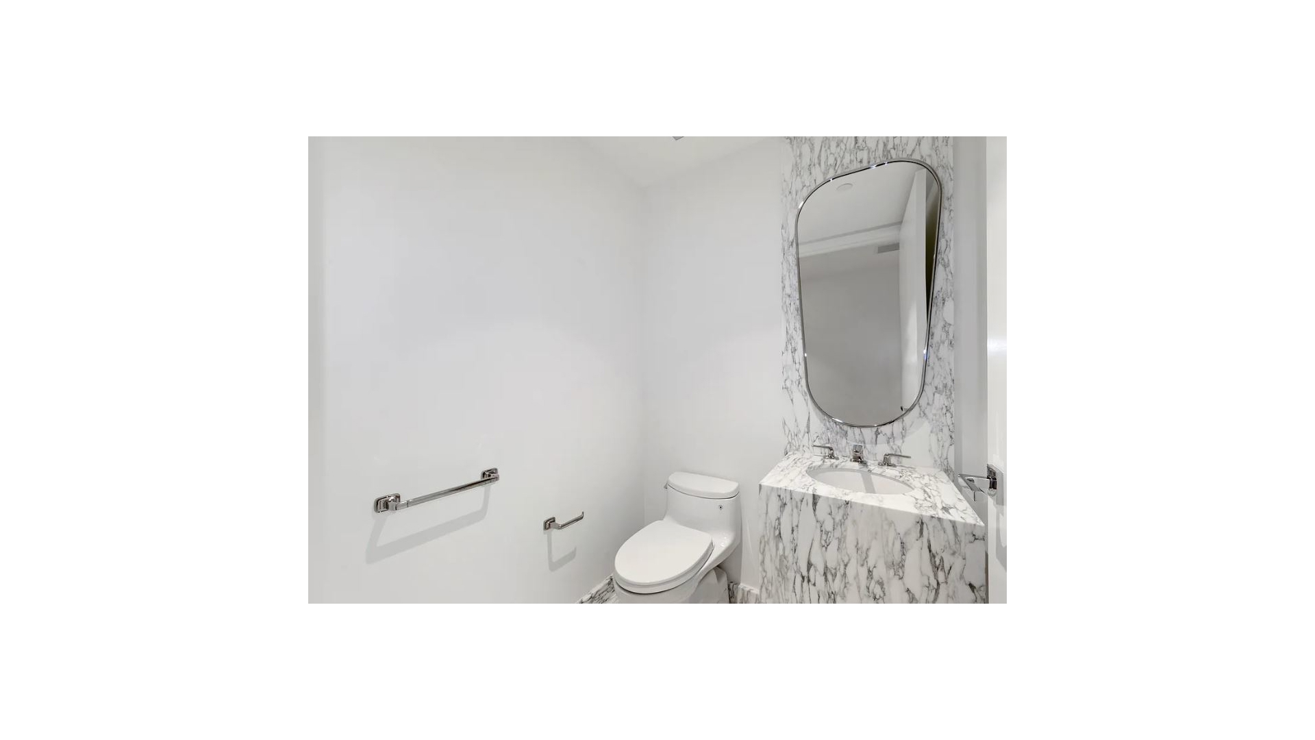 A gracious entry foyer leads through a gallery opening into a spacious living and dining area with wide-plank oak flooring throughout. The powder room is adorned with Paonazzo marble flooring and marble vanity wall.