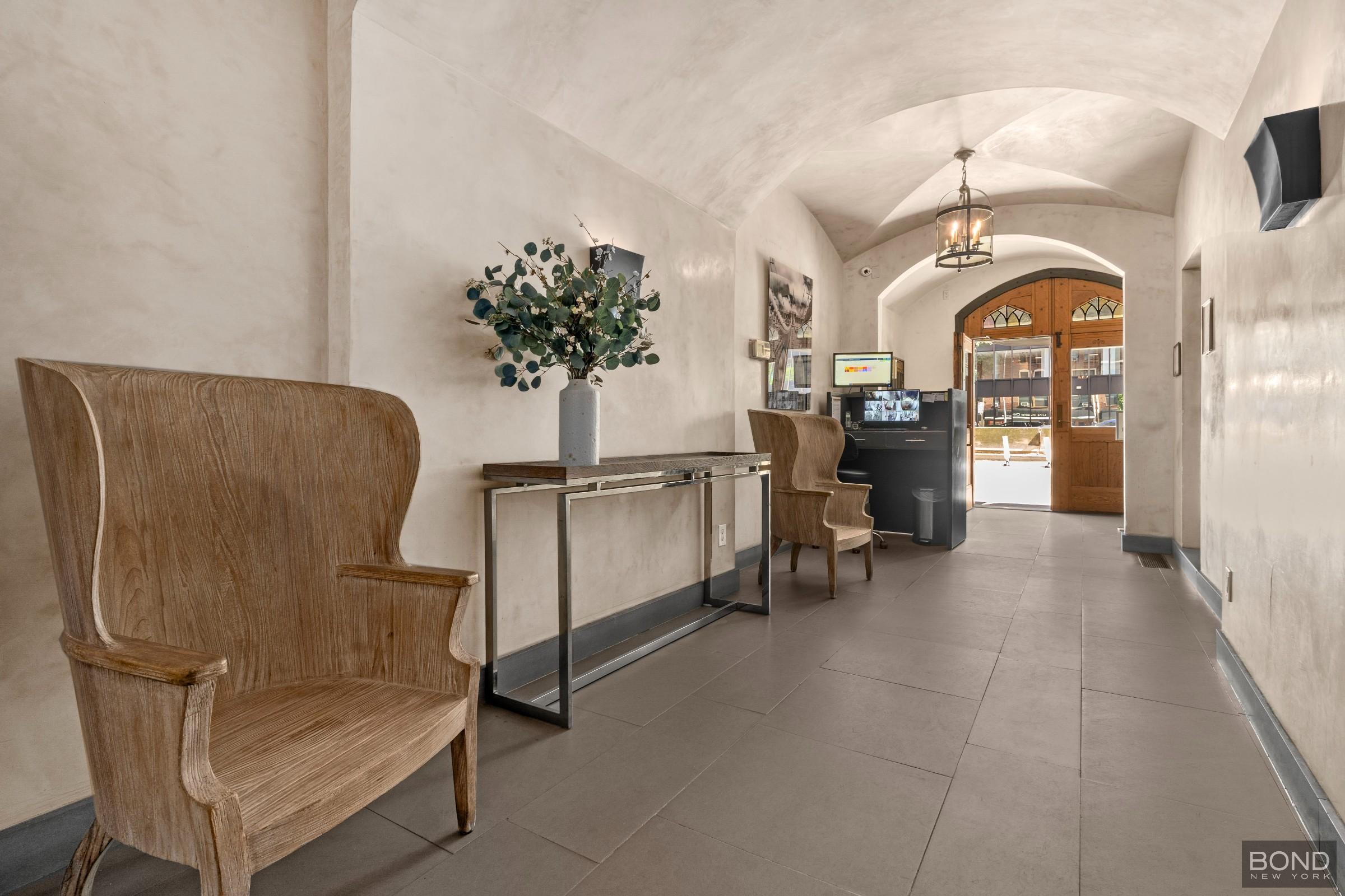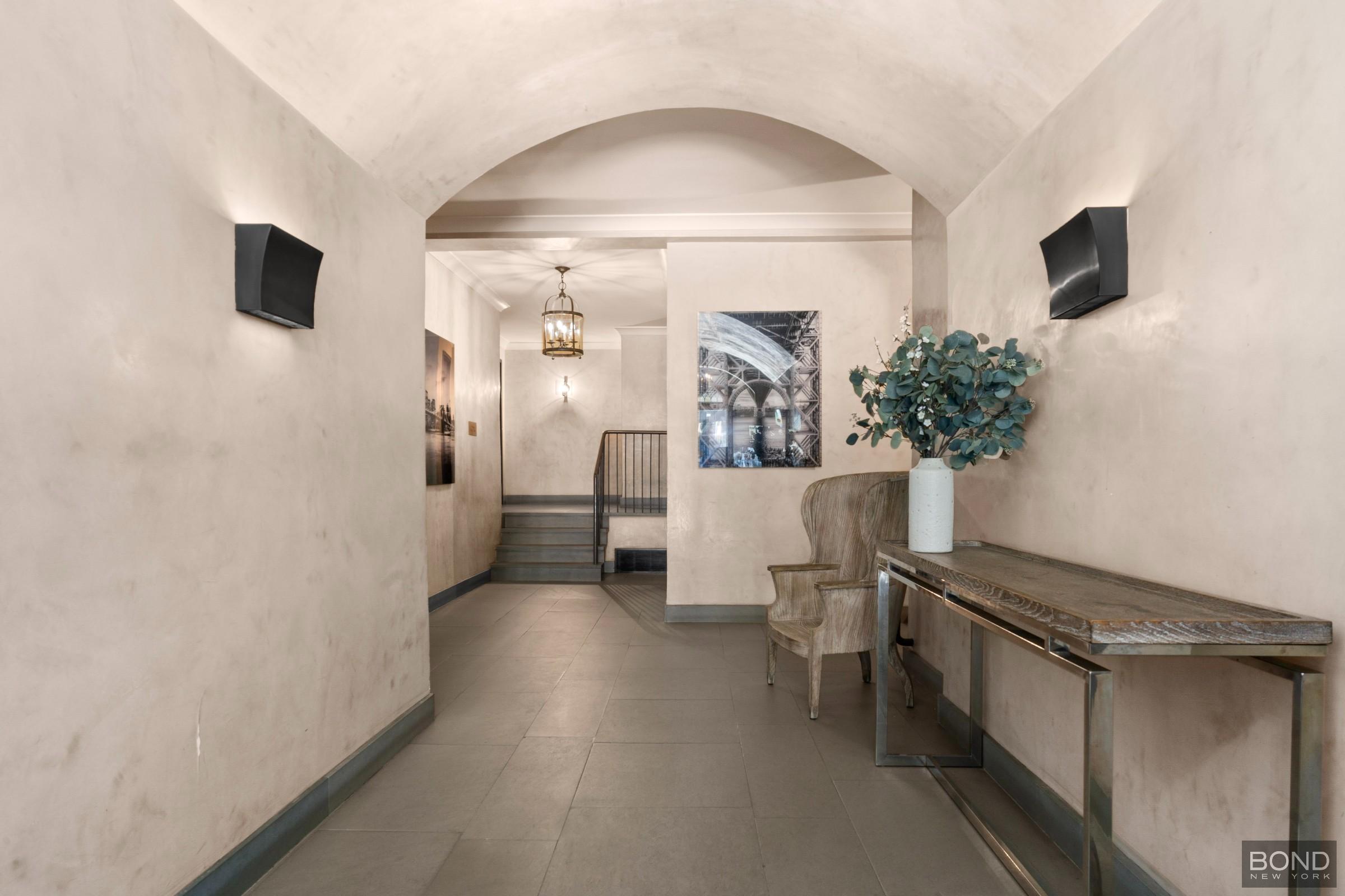 A gracious slate-floored lobby with 24-hour doorman and just five residences per floor provides privacy and calm. The flexible foyer works well as a home office or library and features two large walk-in closets. The windowed kitchen is outfitted with Sub-Zero refrigeration, Miele dishwasher, granite countertops, and ample cabinetry.