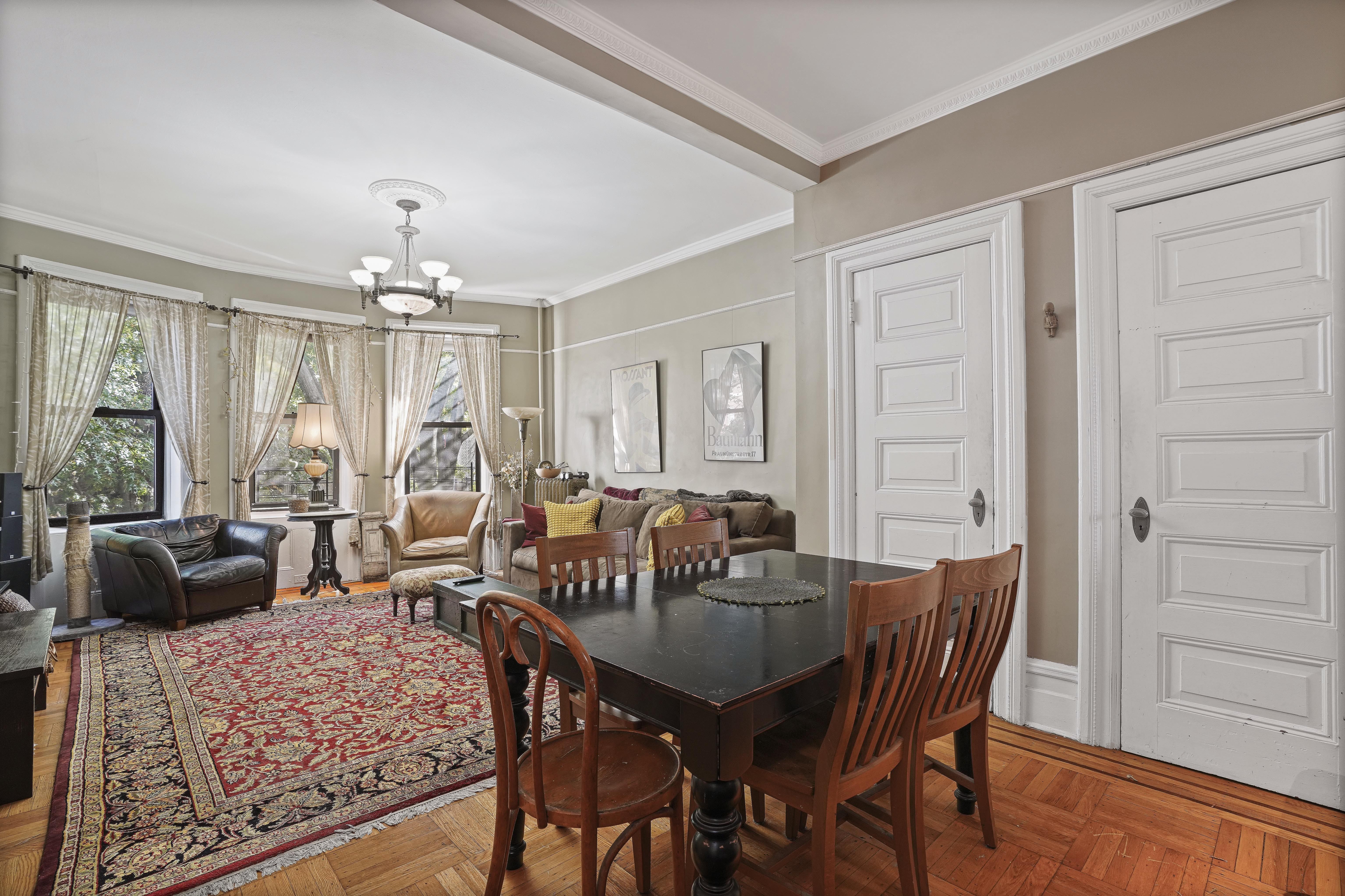 Just one block from Prospect Park, this gracious floor-through residence offers classic brownstone character paired with thoughtful modern updates in an intimate, eight-unit co-op. Bathed in natural light from eastern and western exposures, the home unfolds along a long central hallway that creates privacy and flow between living and sleeping spaces. The inviting living room captures the timeless charm of Park Slope’s historic architecture, while 10-foot ceilings enhance the sense of openness throughout. The updated kitchen features modern appliances and generous cabinetry, opening to a distinct dining area ideal for relaxed gatherings or everyday meals. The serene primary bedroom is positioned at the rear of the home and offers excellent storage. Two additional rooms provide flexible space for nursery, office, or guest use, adapting seamlessly to changing needs. Additional features include: • In-unit washer/dryer • Excellent closet space • Pet-friendly boutique co-op (c. 1903) • Convenient access to the F & G trains A 3D interactive Matterport tour is available upon request for those who wish to explore the home virtually prior to scheduling a visit. A rare opportunity to enjoy the scale and warmth of brownstone living in one of Brooklyn’s most cherished neighborhoods. Apartment Highlights 3 bedrooms (3rd bedroom currently configured as an office) 2 full bathrooms Floor-through layout with excellent flow East/west exposure and abundant natural light Updated kitchen with modern appliances Long hallway providing privacy and separation Pet-friendly boutique co-op (8 units, c. 1903)