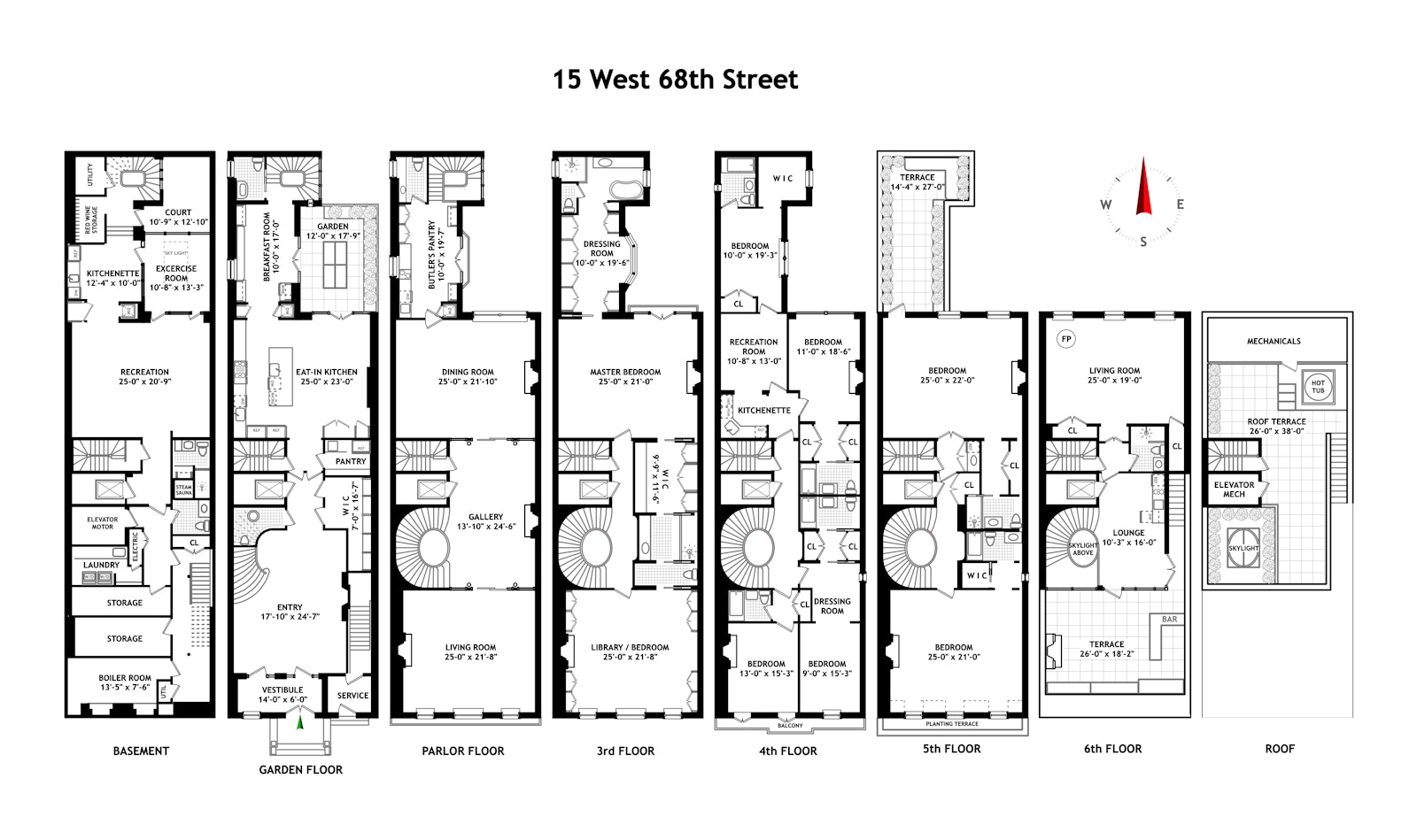 The outstanding outdoor spaces include a Fifth Floor terrace with pergola, Sixth Floor South-facing terrace with Central Park views, an outdoor fireplace and bar, splendid roof deck with a hot tub, and a beautiful garden.