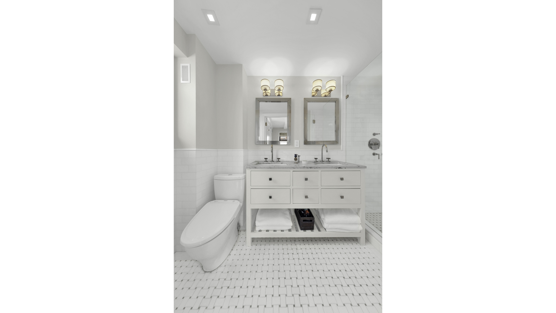 The sunny and spacious windowed kitchen is a chef's dream with an abundance of top-of-the-line appliances, generous workspace, ample storage and pantry, and a charming built-in banquette. The kitchen features a 36" Wolf stove including an indoor gas grill with an exterior venting hood, built-in Miele convection oven, microwave and dishwasher, 100-bottle wine storage unit, double sink and disposal and a 48" Sub-Zero refrigerator with filtered water and ice.Off of the foyer is a private bedroom wing featuring 2 spacious bedrooms, 2 baths, built-in linen storage and a purpose-built laundry closet featuring an externally-vented Miele washer and dryer. The corner primary bedroom suite is bathed in natural light featuring three windows with western and northern exposures, a charming window seat with open city views and multiple custom built-in closets. The en-suite primary windowed bath has a marble countertop, double sinks, glass enclosed stall shower lined with Thassos marble subway tile and basketweave flooring. The second bedroom, also west-facing, includes a custom built-in desk and bookshelf unit along one wall with its own hall bath likewise featuring white Thassos marble subway tile and basketweave flooring, Caesarstone counter, and an enclosed Jacuzzi soaking tub.
