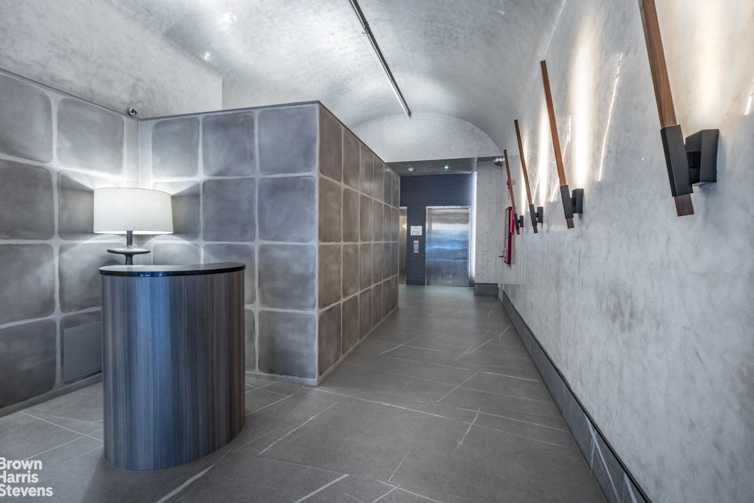 Apartment 9A presents an open-concept layout with 11'4" barrel-vaulted ceilings that enhance the sense of space and light. The unit is adorned with central A/C and features Timber Grassi Bamboo flooring throughout. Natural light floods the apartment through fifteen oversized windows, featuring triple exposure which provides stunning views and an airy ambiance.
