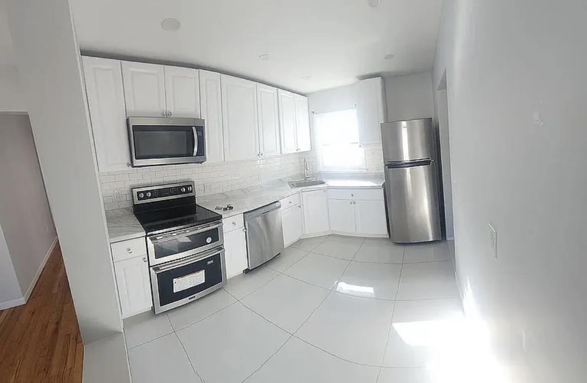 The main level features a spacious, open L-shaped living and dining area, a fully renovated kitchen with marble countertops and floors, a marble bathroom with a separate shower, a welcoming foyer, and 3 generously sized bedrooms, including the primary bedroom.