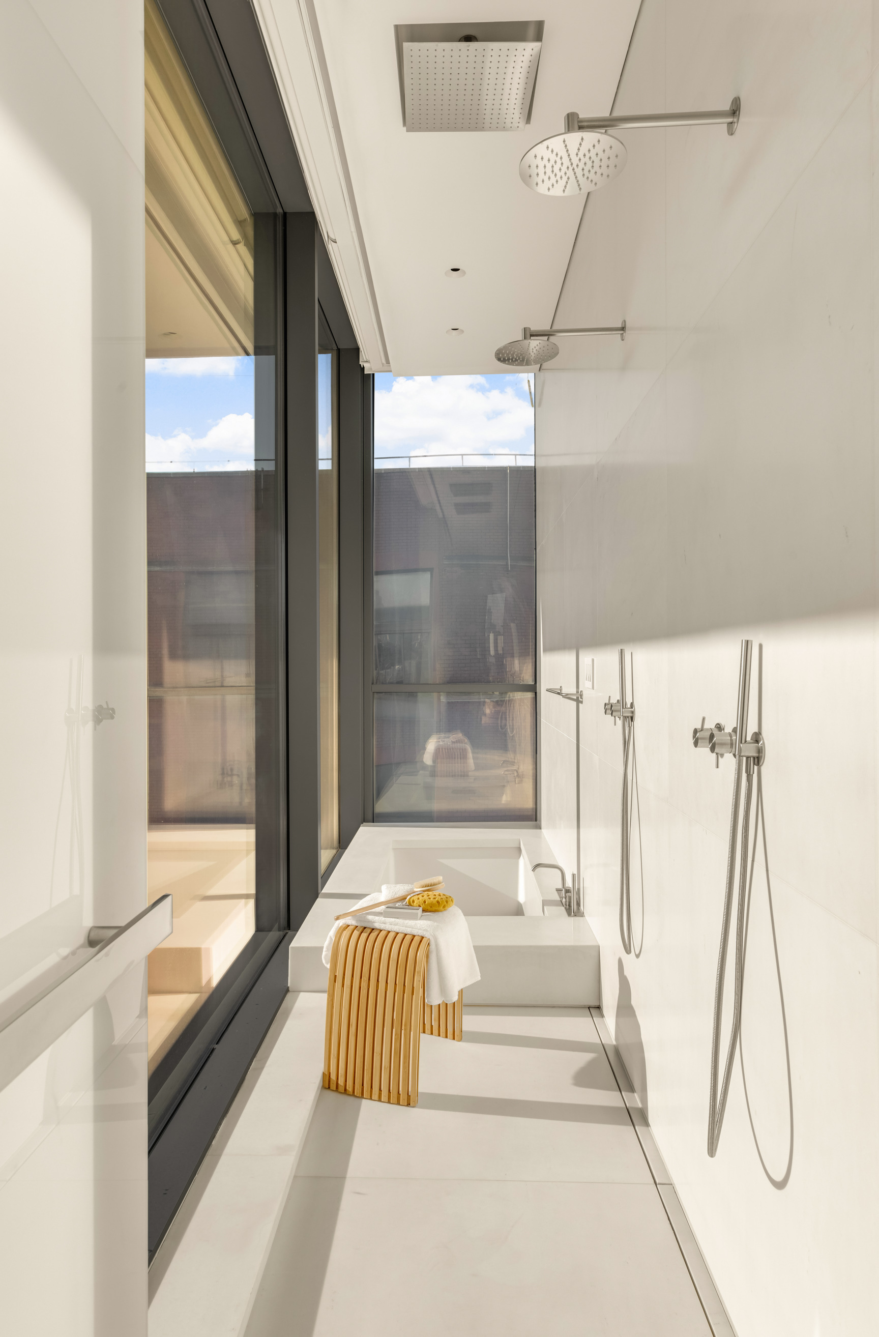 With boundless exposures of the Empire State Building, One World Trade Center, and Williamsburg Bridge — the landscaped roof terrace features a full kitchen, an Ando designed granite fi replace and custom-carved granite soaking tub, as well as an Ando signature reflecting pool. Amenities include a full-time doorman, 2 automated parking spots and private storage adjacent to the unit.