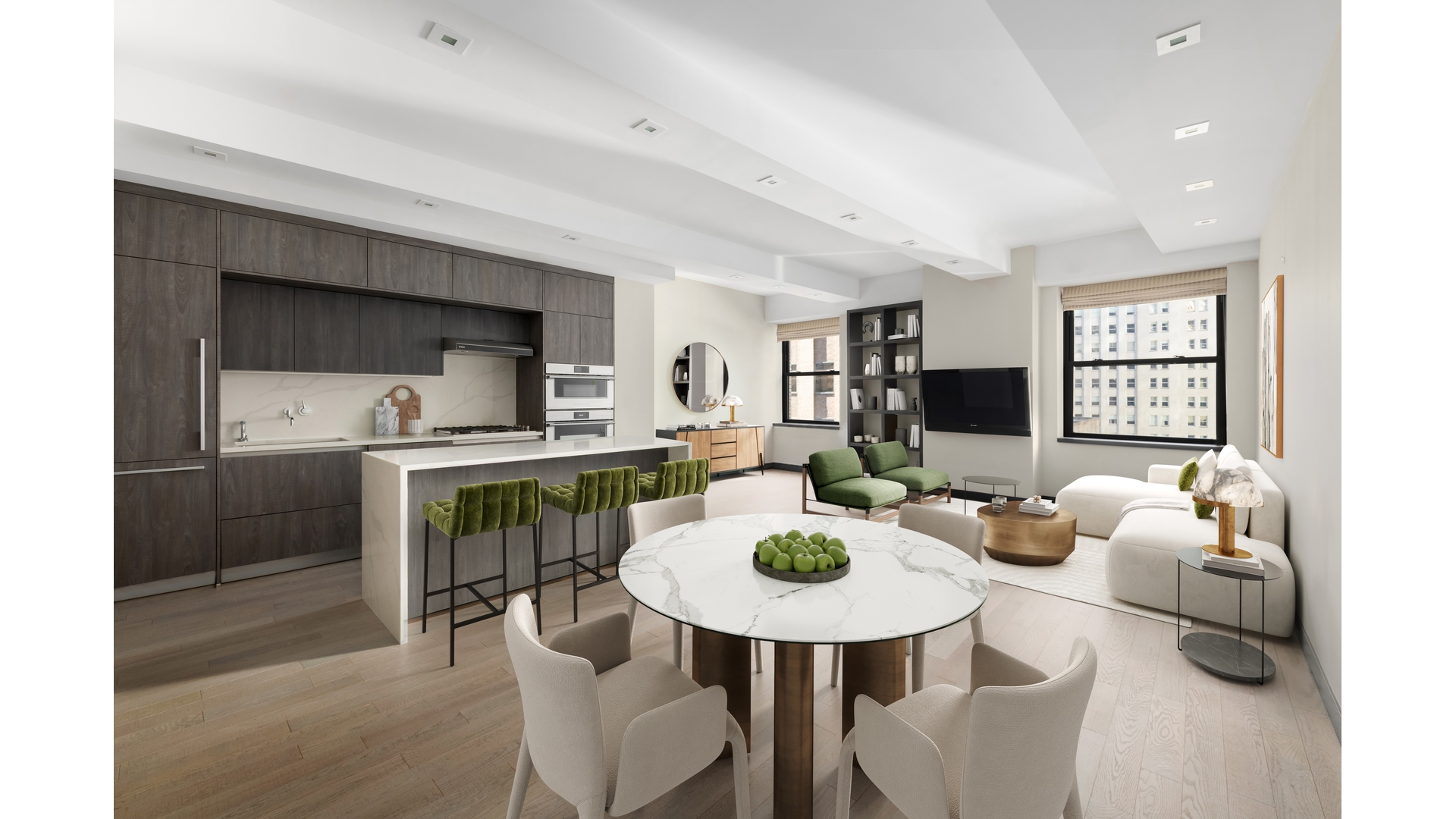 Entering into the Great Room you are met with large South-facing windows that flood the room with natural light and look over open views of the Federal Hall and iconic New York Stock Exchange.