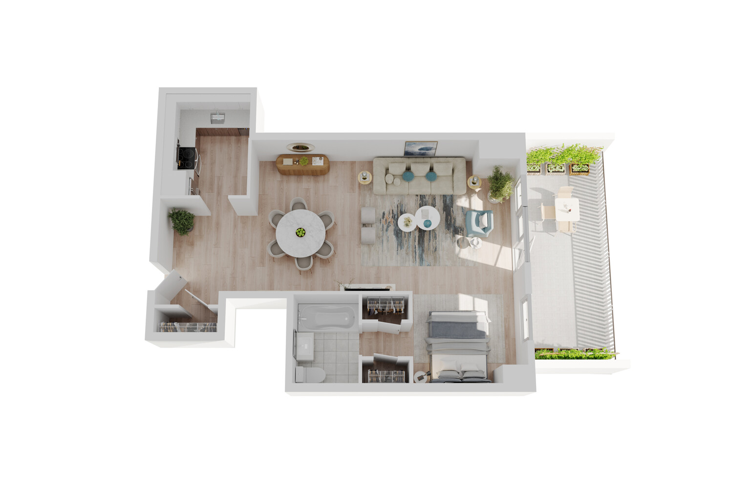 The thoughtfully designed layout offers a clear separation between living and sleeping areas, giving the feel of a junior one-bedroom. The spacious living area comfortably accommodates both lounging and dining, and is complemented by warm oak floors, generous closet space, and an updated, spa-like bathroom.