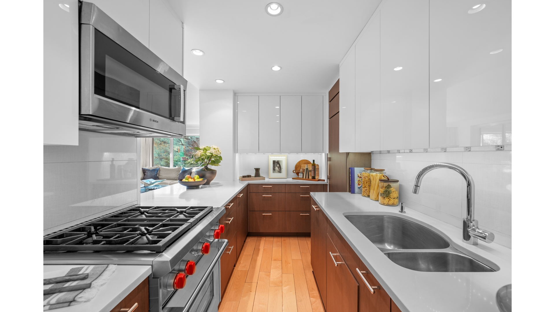 The designer chef's kitchen features handsome Caesarstone Quartz countertops and has been opened to the living space with a lovely dining bar, perfect for entertaining friends or casual everyday life. Premium appliances by Miele, Bosch, and Subzero, custom cabinetry with integrated underlighting, a Miele washer/dryer discreetly built-in, and a large walk-in pantry defines the space for sophisticated living.