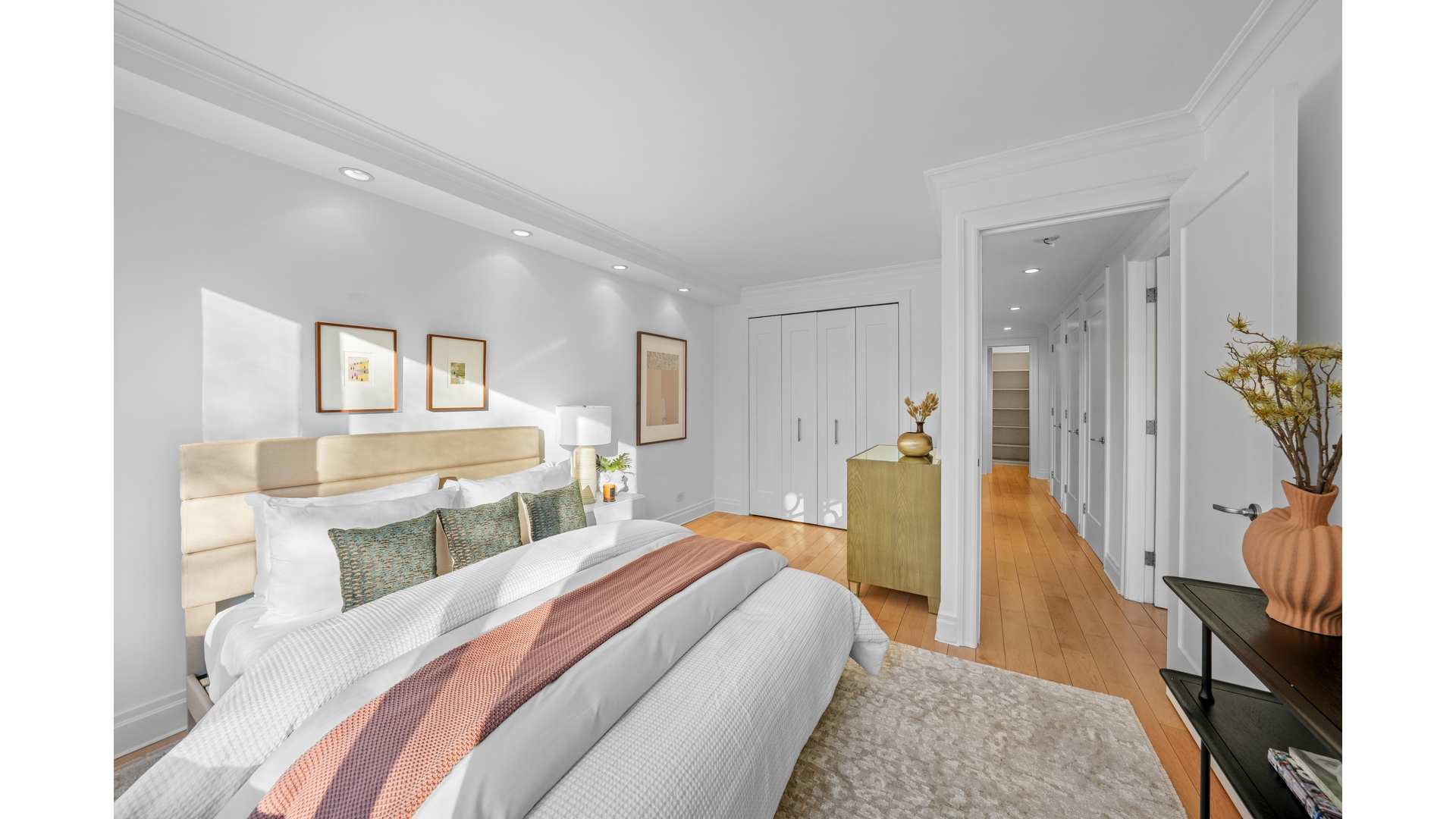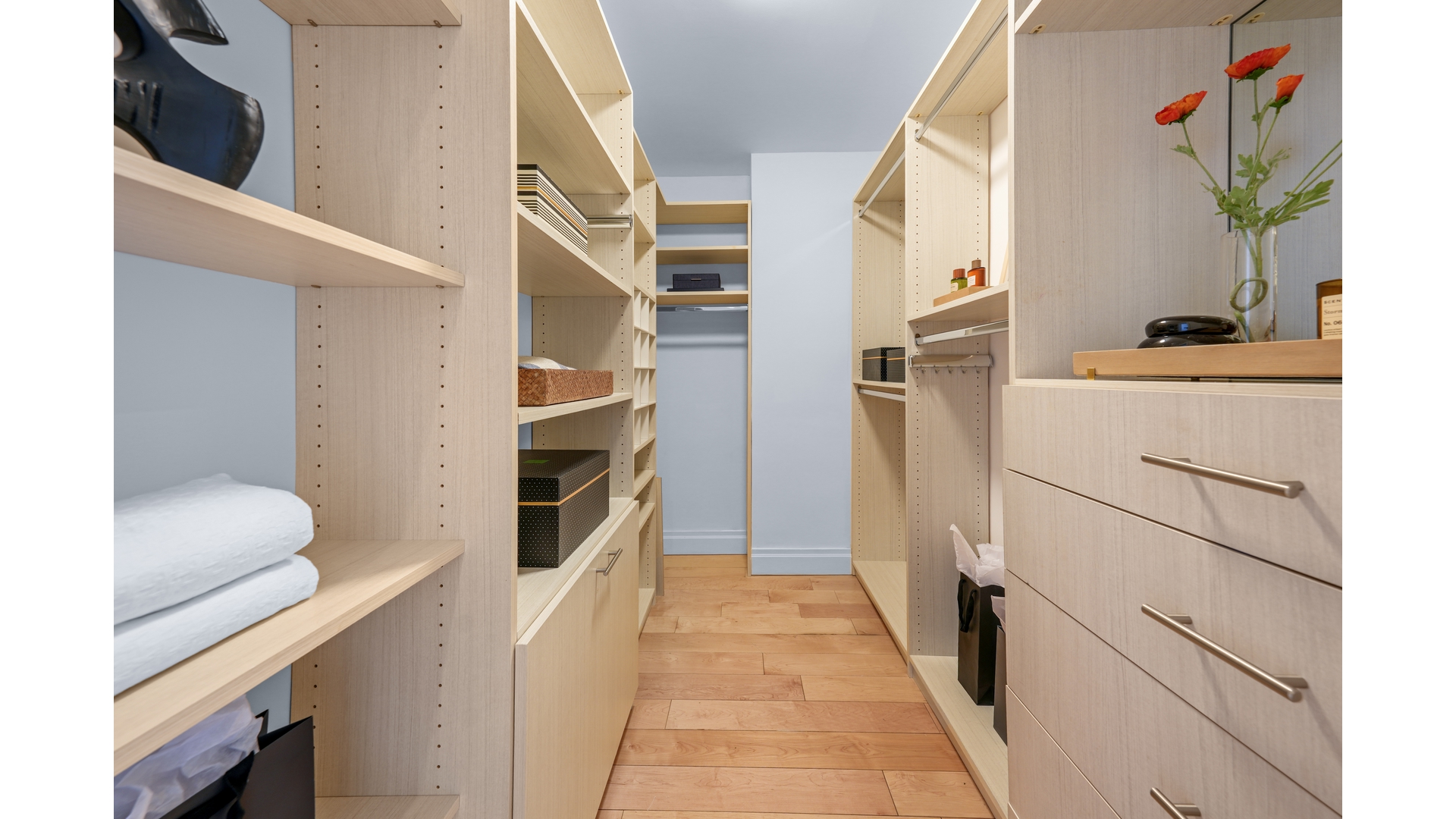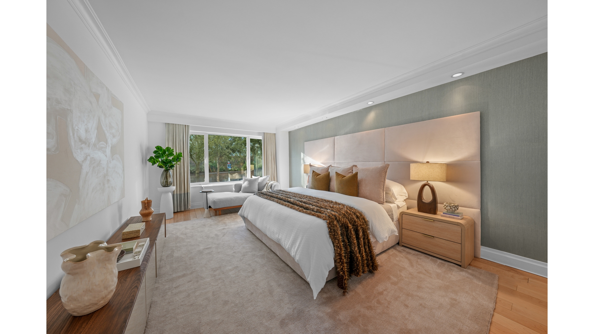 The three bedrooms sit in their own wing and are tranquil retreats, featuring custom blinds with solar and blackout shades, fitted closets, and calming Park views. The expansive primary suite offers a spa-inspired en-suite bathroom clad in exquisite stone from Porcelanosa, and designer fixtures by Kohler, Toto, and Robern, as well as two custom fitted closets including a very large walk-in.