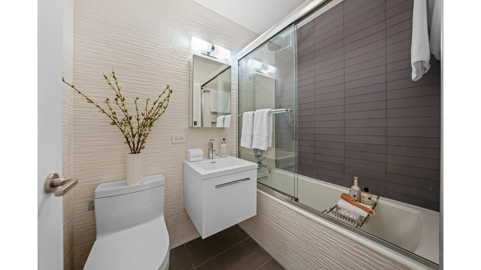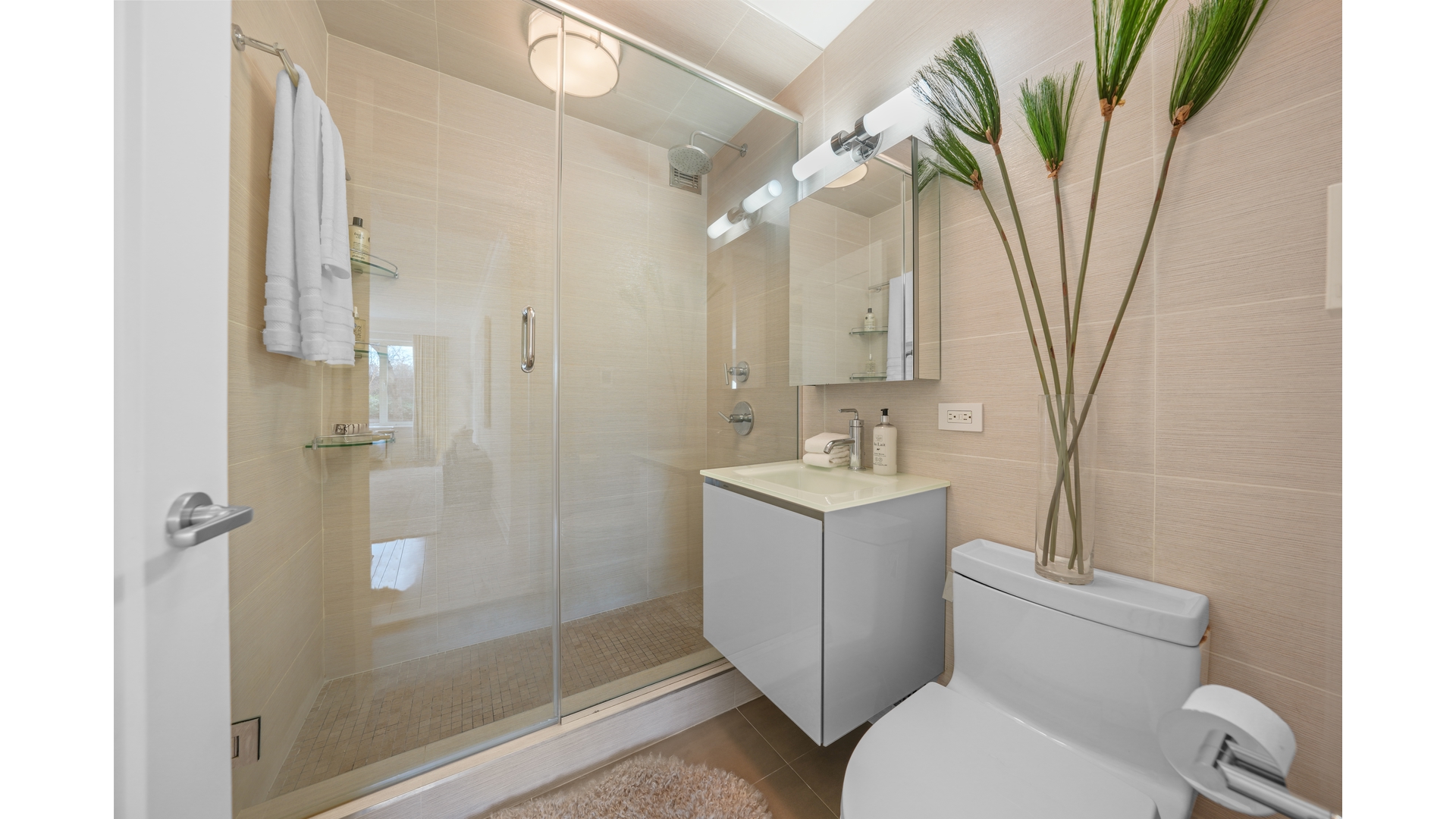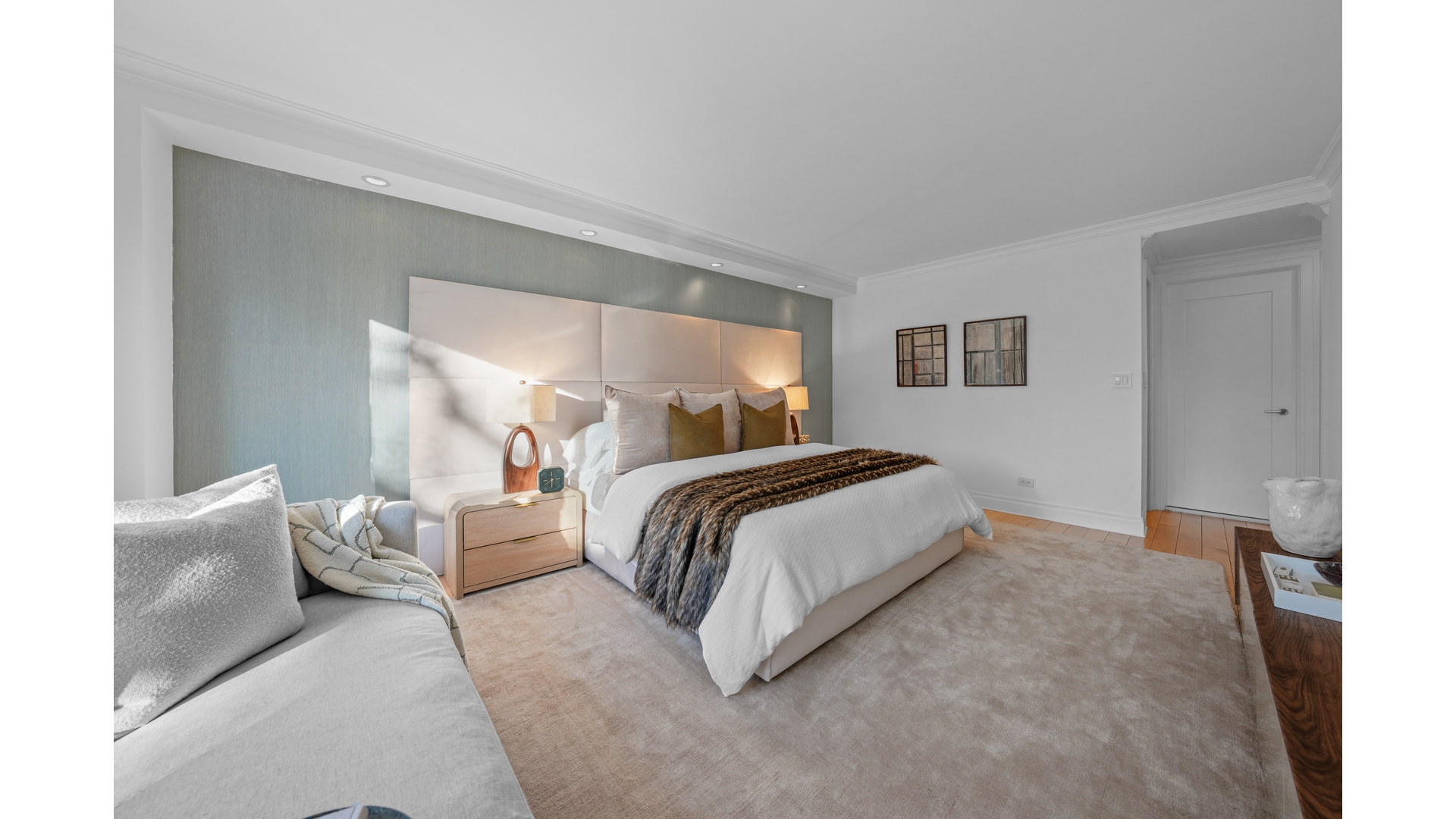 The three bedrooms sit in their own wing and are tranquil retreats, featuring custom blinds with solar and blackout shades, fitted closets, and calming Park views. The expansive primary suite offers a spa-inspired en-suite bathroom clad in exquisite stone from Porcelanosa, and designer fixtures by Kohler, Toto, and Robern, as well as two custom fitted closets including a very large walk-in.
