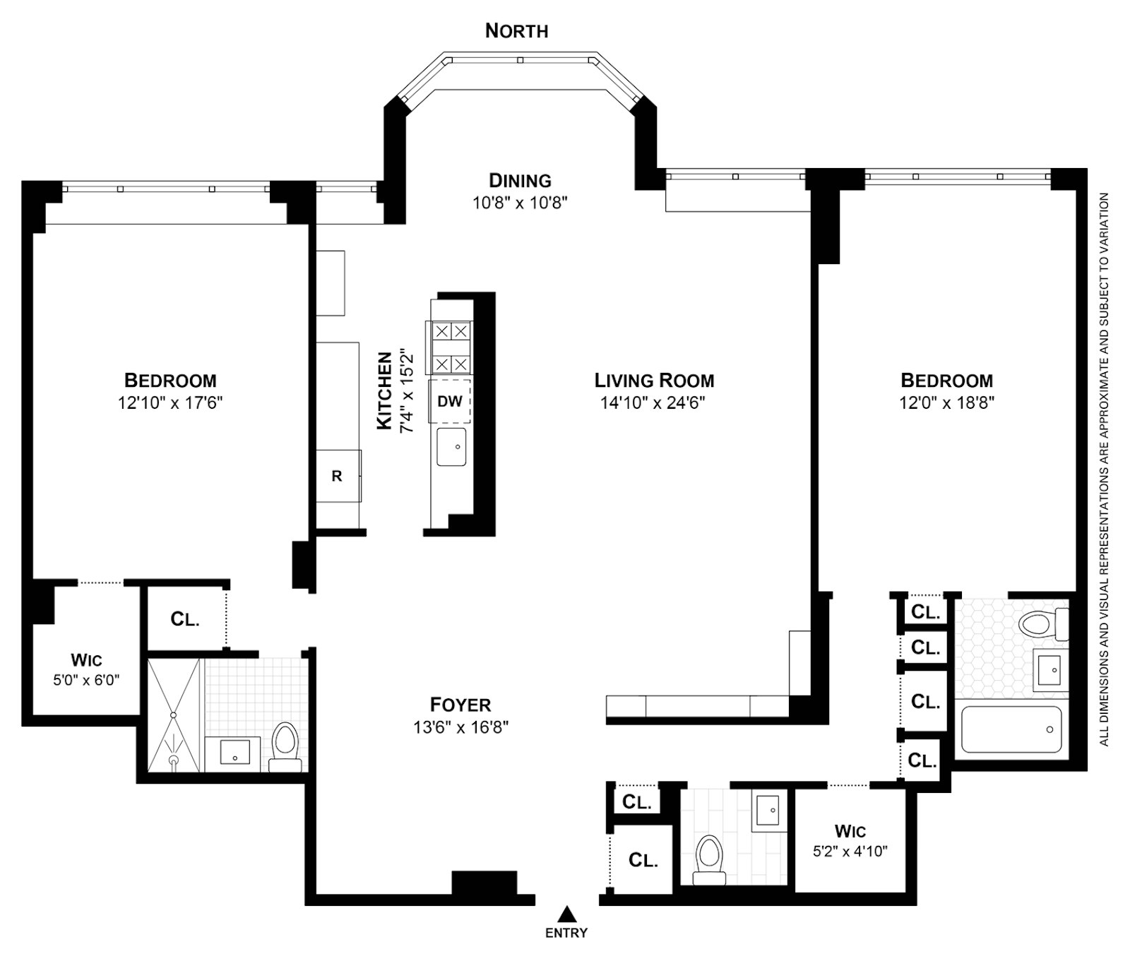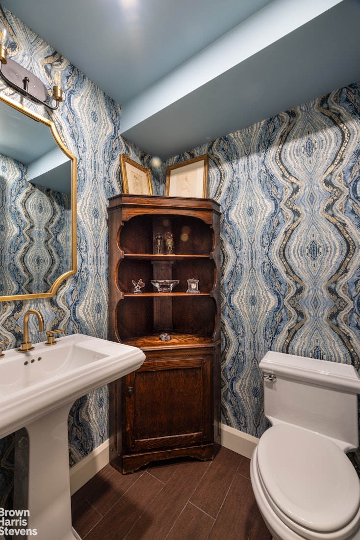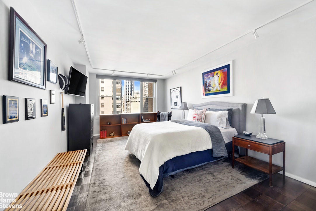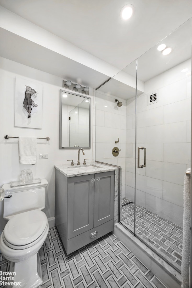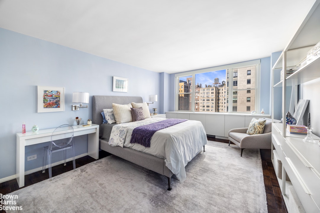 The primary suite is generously proportioned and features a walk-in closet, an additional closet, and a beautifully renovated en-suite bath appointed with a glass-enclosed shower, marble vanity top, and bespoke mosaic tile floors. On the opposite side of the apartment, the second bedroom enjoys its own private wing, with expansive city-view windows, multiple closets, and a renovated en-suite bath complete with a soaking tub. A well-appointed powder room, finished with statement wallcovering and brass fixtures, adds a sophisticated touch for guests. W/D allowed upon board approval.