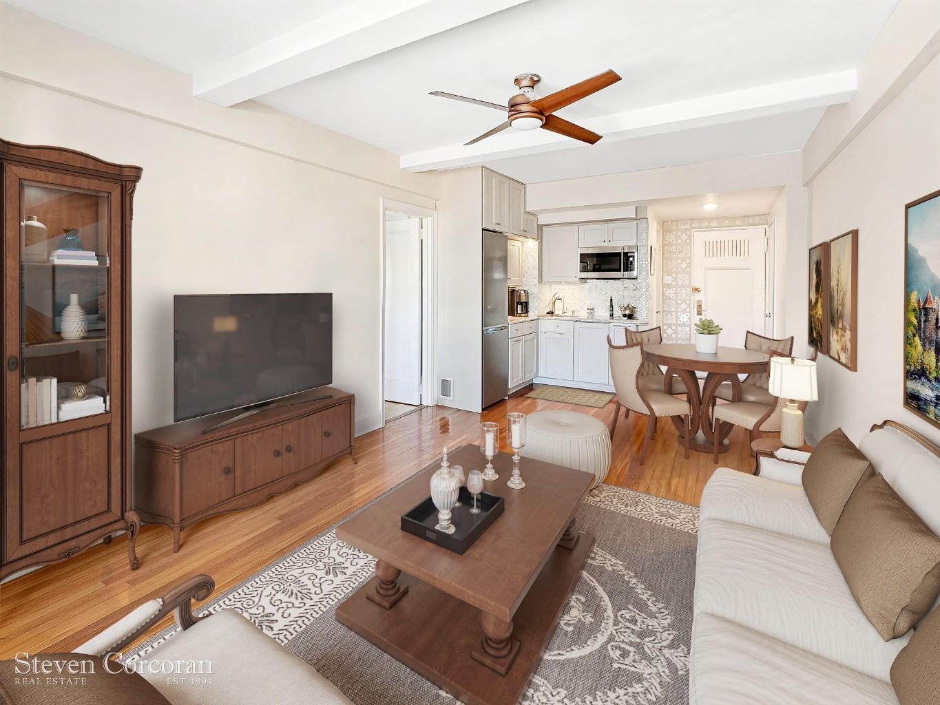 The apartment has been renovated, with a new kitchen, new windows throughout, and a through-the-wall air conditioning and Heating Unit.
