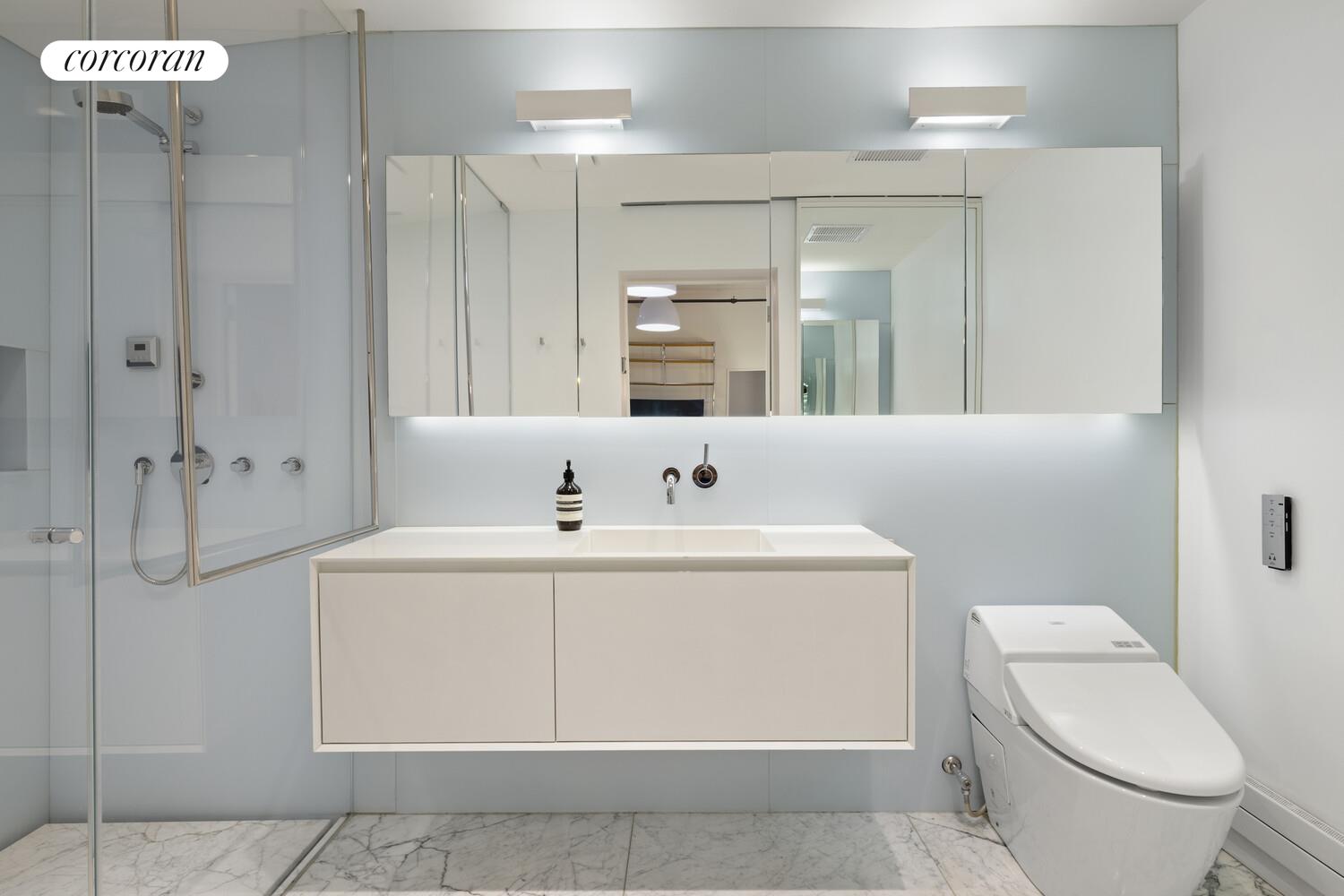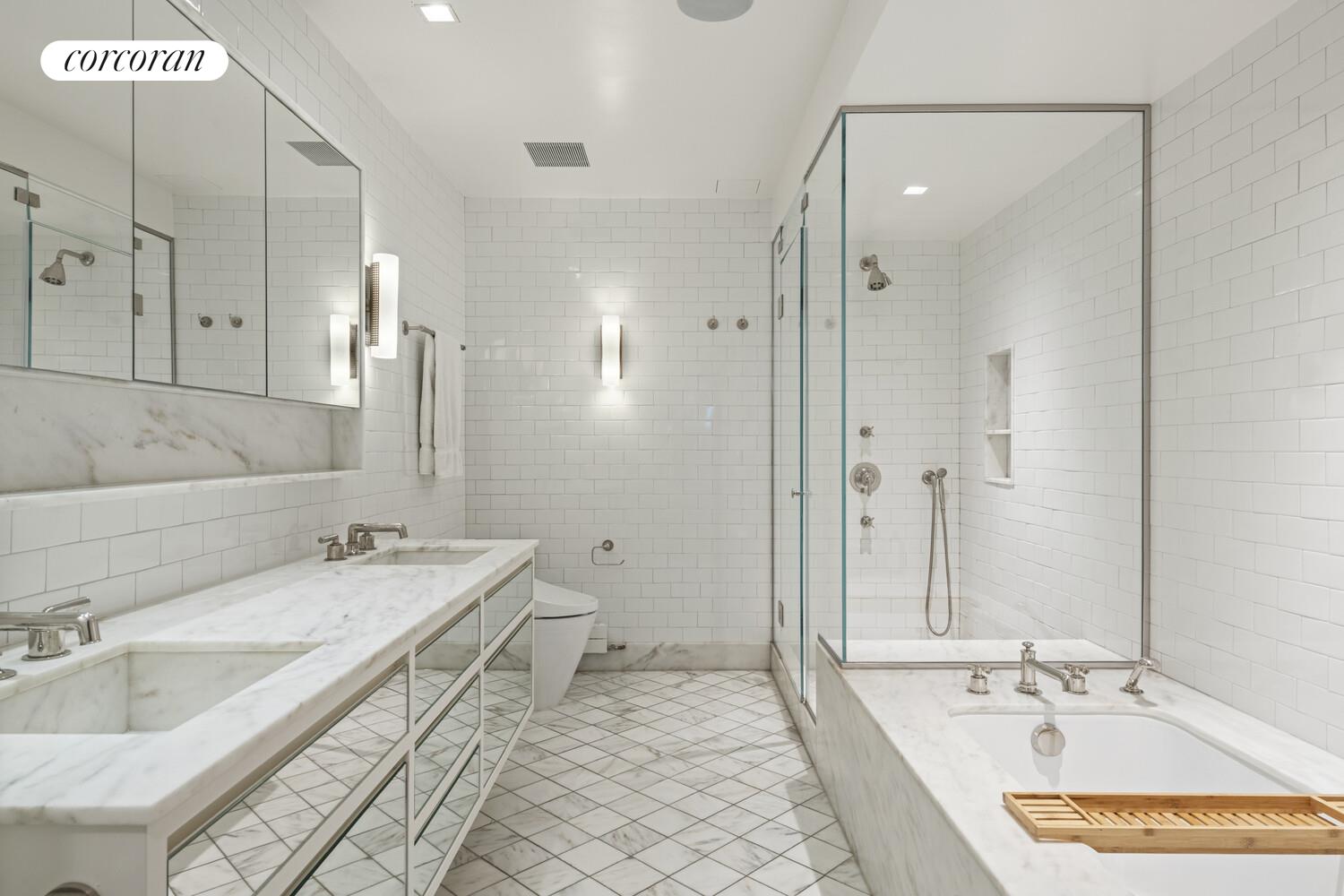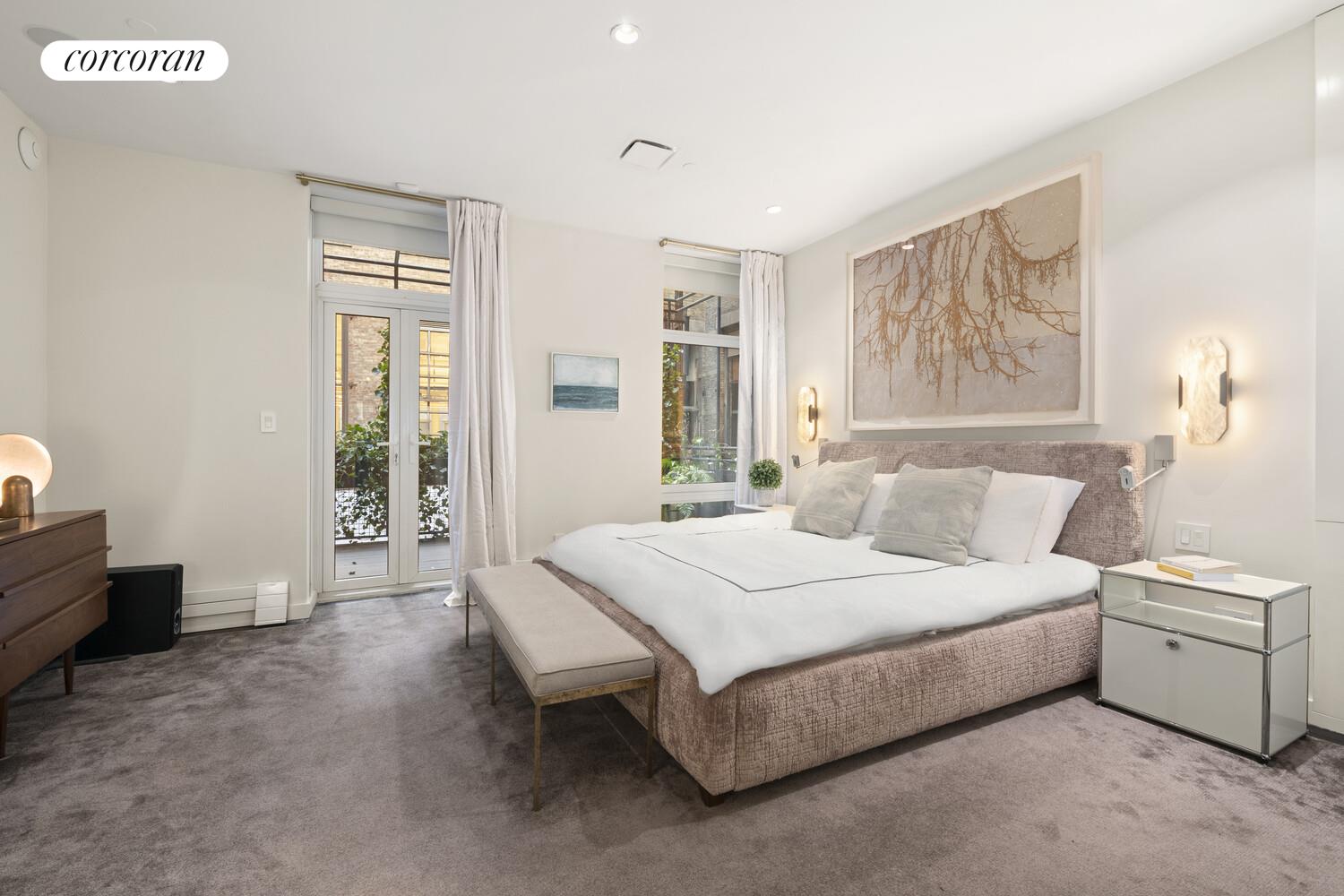 The king-sized primary suite offers a peaceful retreat with direct access to a planted and irrigated private balcony, a customized walk-through closet, and a spa-inspired en-suite bath featuring Waterworks and Toto fixtures, a double vanity, soaking tub, and oversized stall shower.