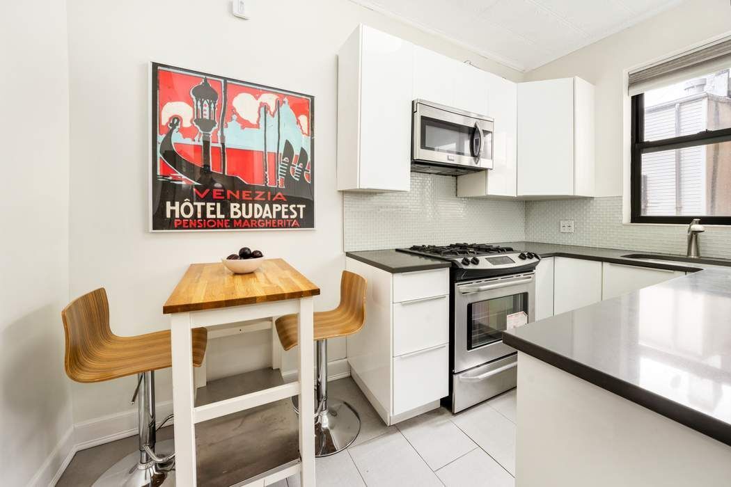 The windowed kitchen has been tastefully renovated with both style and function in mind, offering an eat-in breakfast area, plethora of cabinetry for exceptional storage, and abundant counterspace. Stainless steel appliances include a gas range, microwave, dishwasher, and refrigerator. The bedroom is peaceful and well-proportioned, complete with a generous closet and tree lined views. The windowed bathroom is beautifully appointed and conveniently located.