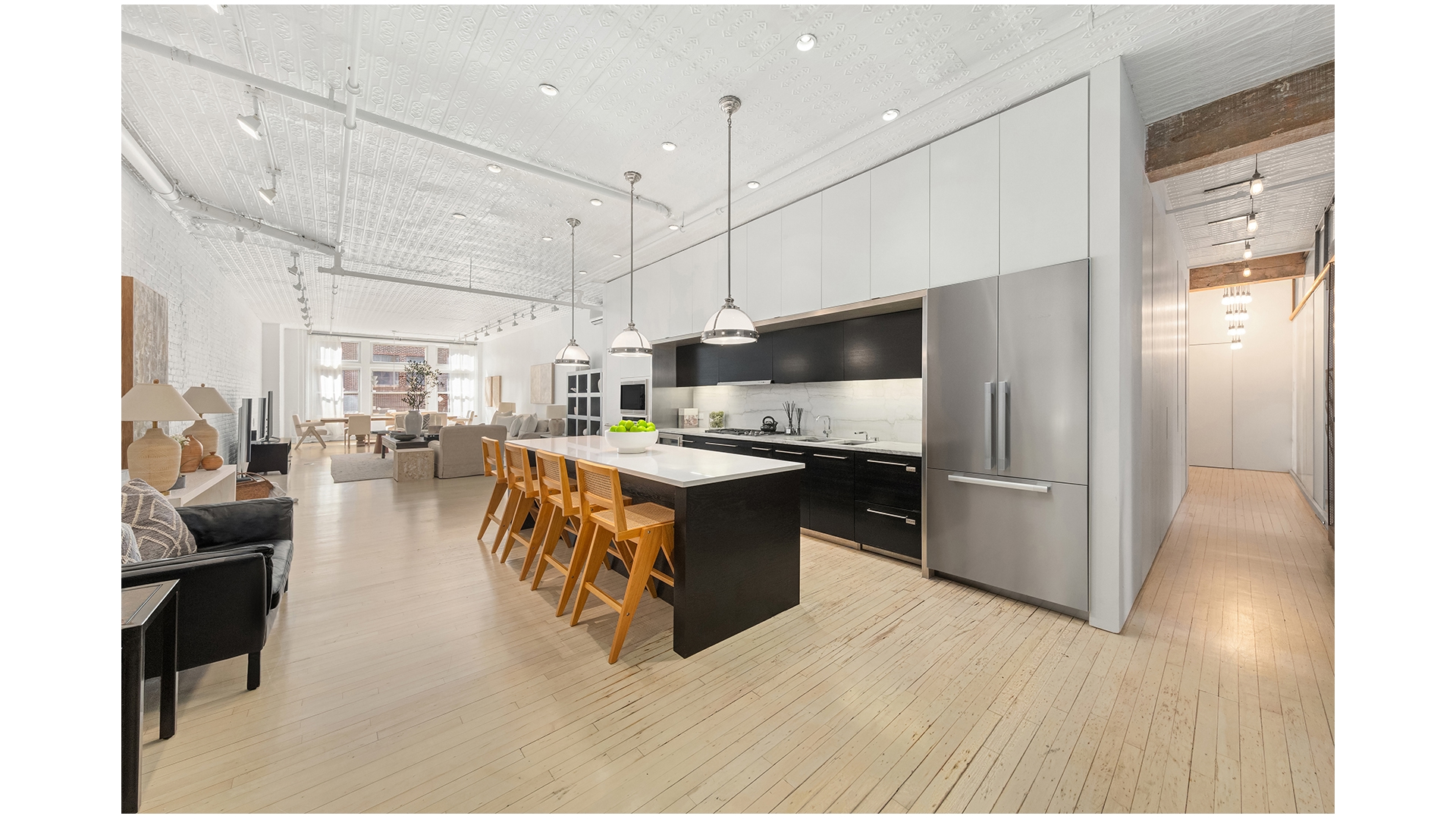As you enter, you're greeted by a dramatic foyer with a back-lit Onyx wall and custom industrial pendant lighting. The spacious Living/Dining room features original tin-pressed ceilings, Cuban hand-rubbed, white-washed brick, pickled maple flooring, and southern light pouring in through a wall of windows. The open chef's kitchen, with Leche de Luna stone countertops, custom beechwood cabinetry, and top-of-the-line appliances, including a Viking refrigerator and Wolf range-is a dream for entertaining.