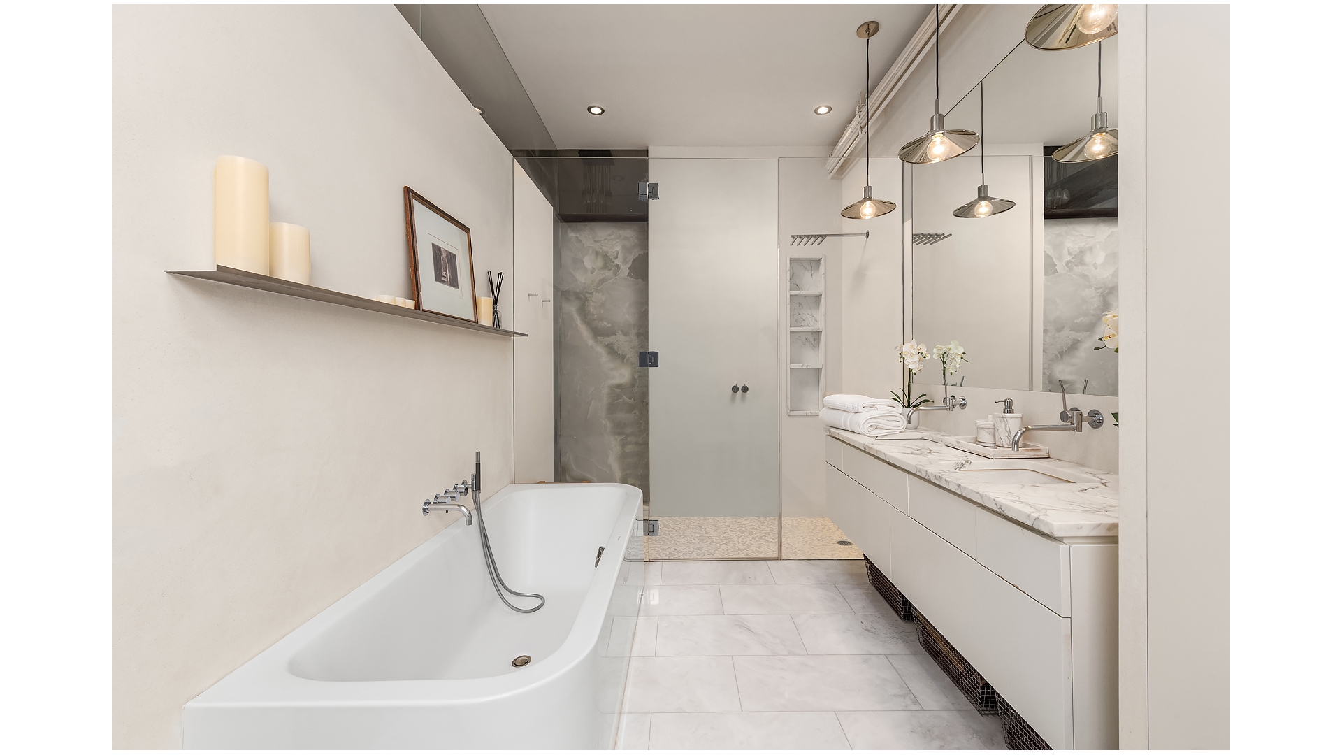 The sunny Master Bedroom Suite offers a serene retreat with Venetian plaster walls, exposed beams, and an enormous custom walk-in closet. The luxurious Master Bathroom features a deep Duravit soaking tub, honed Carrera marble, antique mercury glass lights, and a glass-enclosed shower with hand-cut mosaic tiles and custom Vola fixtures.