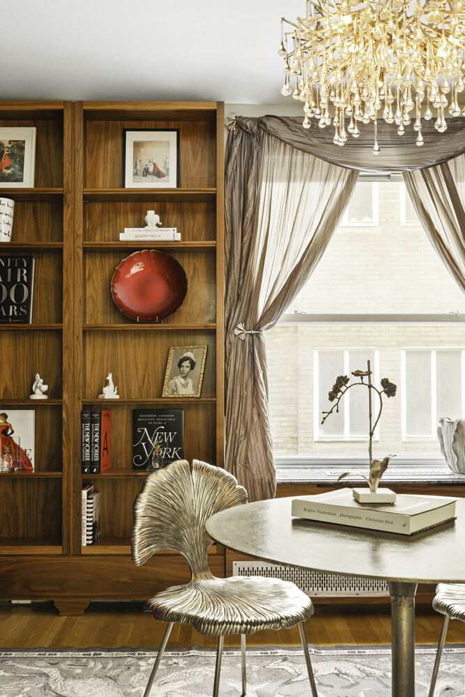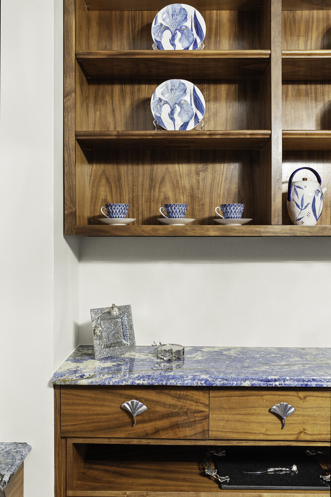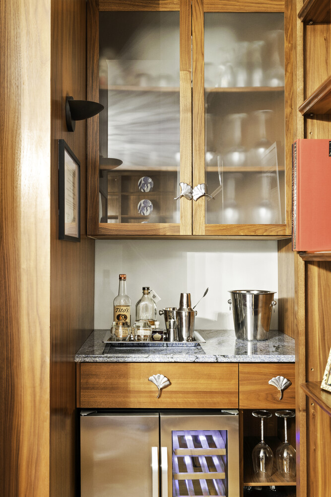 The formal dining room is one of the most remarkable spaces in the residence. Custom floor-to ceiling walnut cabinetry wraps three walls. A sculptural crystal chandelier anchors the room. The dedicated wet bar nook is tucked seamlessly into the millwork; complete with a built-in dual zone wine and beverage fridge. With exotic Brazilian Blue Bahia quartzite countertops, glass-front upper cabinets, and hand-cast ginkgo hardware throughout, it is the kind of room that makes entertaining feel effortless. For buyers who don't need a formal dining room, the space converts